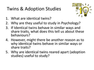 The document discusses twin studies as a method used in psychology to understand the influence of genes and environment on behaviors and traits. Identical twins are useful to study because they share 100% of their genes. Comparing identical twins who were reared together or apart, as in adoption studies, allows researchers to determine if similarities in behaviors are due to genetic or environmental factors. The Gottesman and Shields study compared schizophrenia concordance rates in identical and fraternal twins to investigate the relative genetic and environmental influences on the disorder. The study found higher concordance in identical twins, supporting a genetic influence, but less than 100% concordance, also indicating an environmental role. Twin studies are a valuable method but have limitations such as potential bias in
