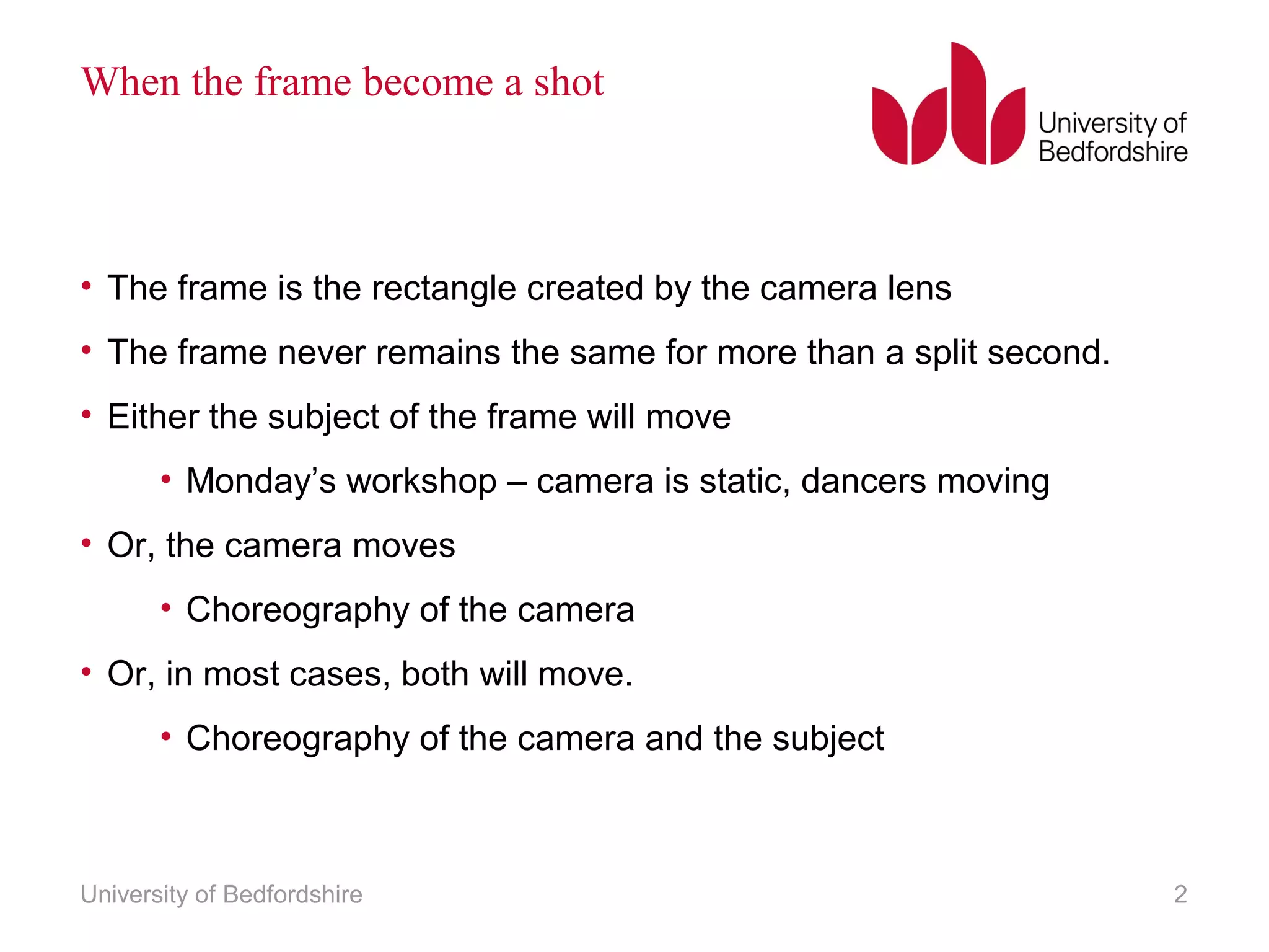 The document outlines the choreography of camera movements in relation to dance, highlighting how static and moving elements combine to create dynamic shots. It describes various camera techniques such as panning, tilting, rolling, and tracking, emphasizing their role in crafting visual narratives. Additionally, it presents two tasks for students involving continuous shots and in-camera montage, requiring careful planning and execution.