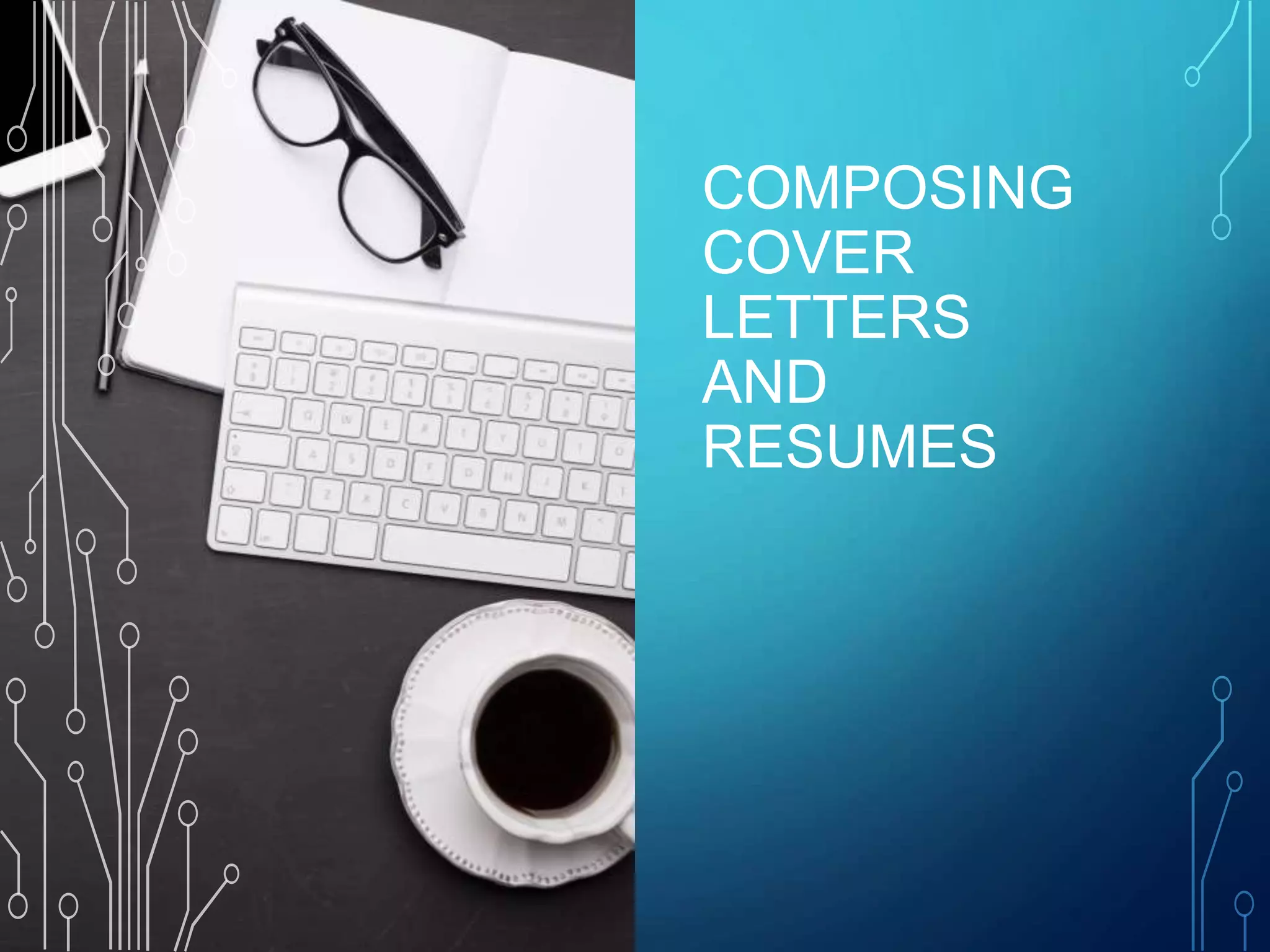 This document provides guidance on writing effective cover letters and resumes. It recommends that cover letters should: 1) Get the reader's attention by directly addressing them and mentioning any inside connections; 2) State your interest in the position by highlighting relevant qualifications and knowledge of the company; 3) Build the reader's desire to hire you by answering why they should hire you and emphasizing your skills and accomplishments. It also advises to 4) Move the reader to action by requesting an interview and informing them you will follow up. The document outlines a typical 4 paragraph structure for cover letters.