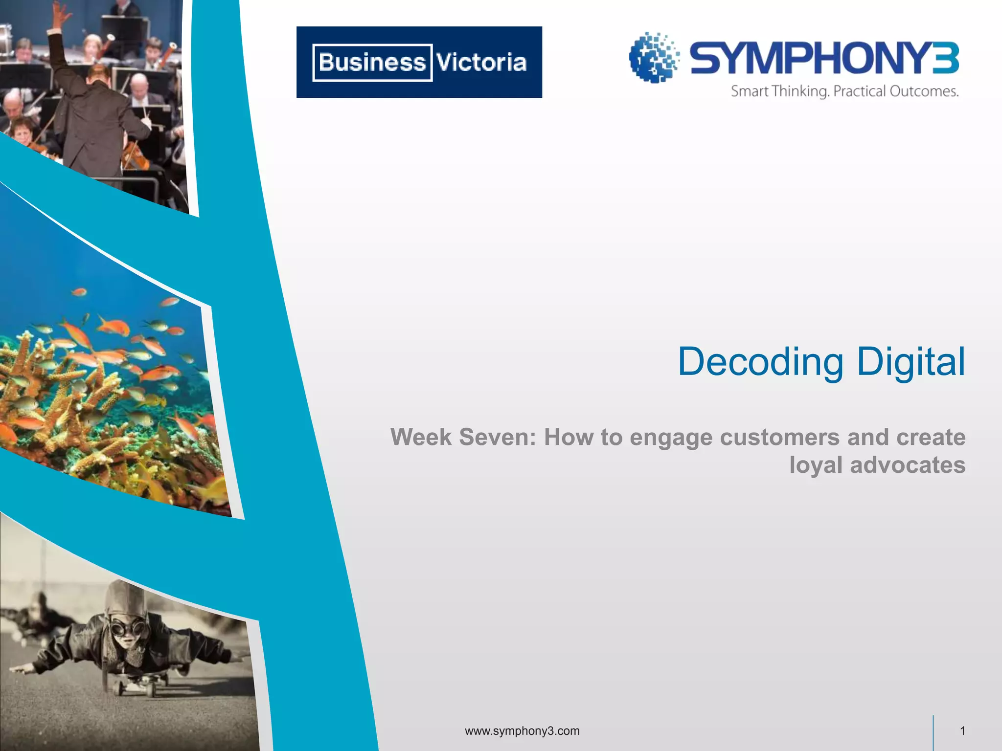 The document outlines a webinar series focused on digital engagement, culminating in week seven's discussion on how to engage customers and cultivate loyalty. It emphasizes the importance of engaged customers as advocates who can generate referrals and provide feedback for product improvement. The presentation includes case studies that illustrate effective engagement strategies, such as co-creation and the use of social media platforms.