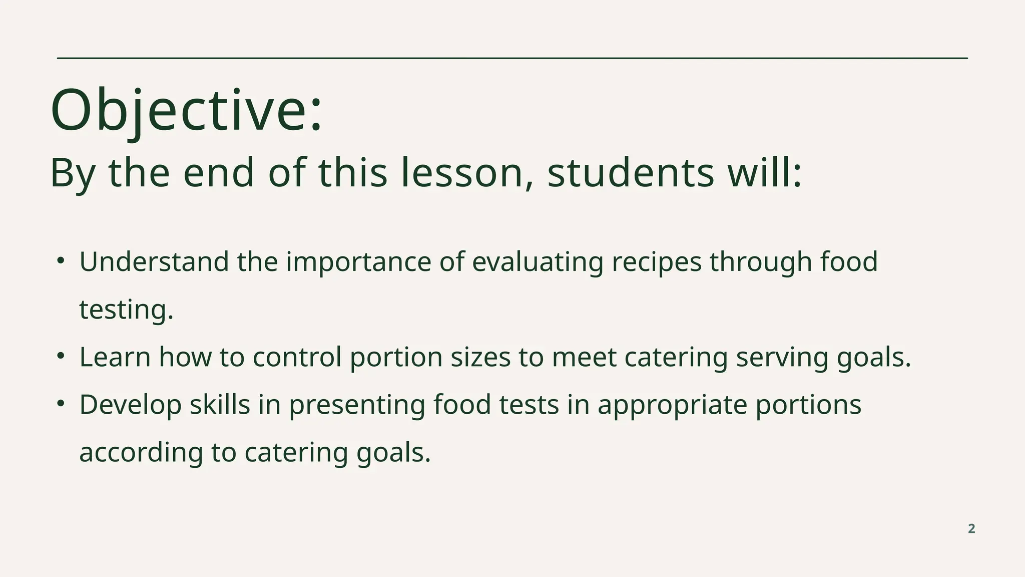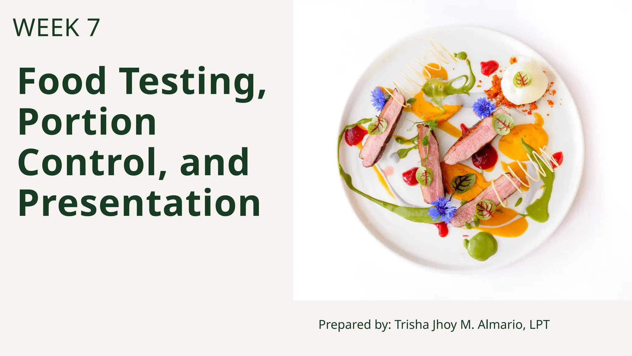 Develop skills in presenting food tests in appropriate portions according to catering goals.