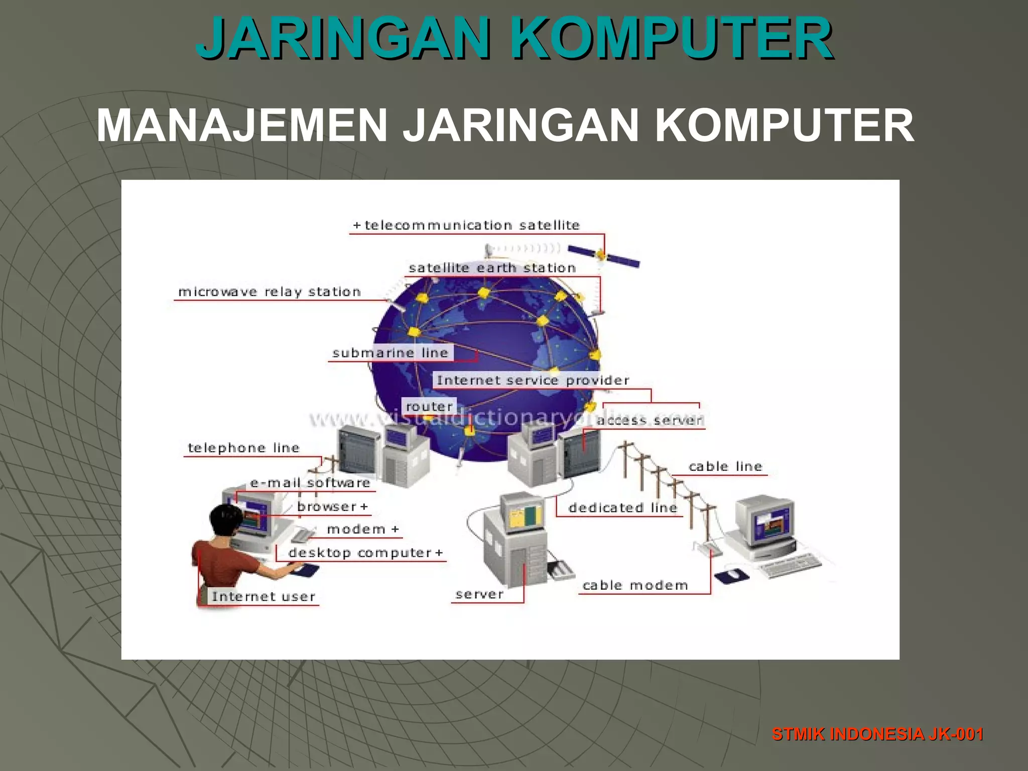 Dokumen tersebut membahas tentang manajemen jaringan komputer, yang meliputi pemeliharaan dan perbaikan seluruh komponen jaringan untuk menjaga kinerjanya, serta penambahan fasilitas sesuai kebutuhan organisasi. Aktivitas manajemen jaringan mencakup pengelolaan kesalahan, perangkat, konfigurasi, kinerja, sejarah, keamanan, dan jangkauan jaringan.