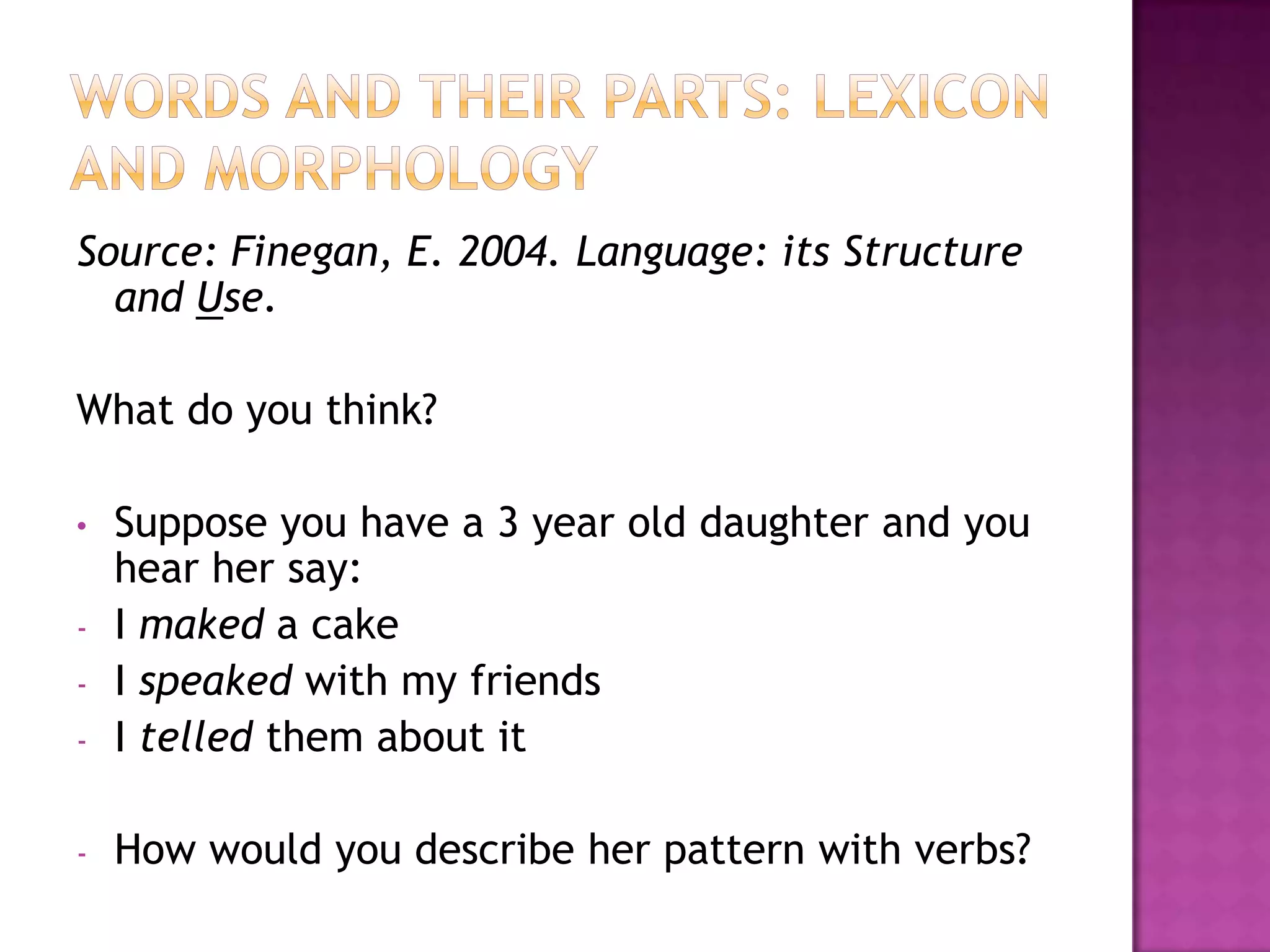 This document discusses how knowing a word involves understanding its sound, meaning, morphological formation, and syntactic category and use. It provides examples of how verbs have related forms like talk/talks and can be preceded by auxiliary verbs. Nouns have singular and plural forms and can be preceded by articles. Identifying parts of speech involves looking at related forms and common syntactic patterns, like verbs occurring with auxiliaries and nouns taking articles. The document aims to describe the core components of lexical and morphological knowledge involved in fully knowing a word.