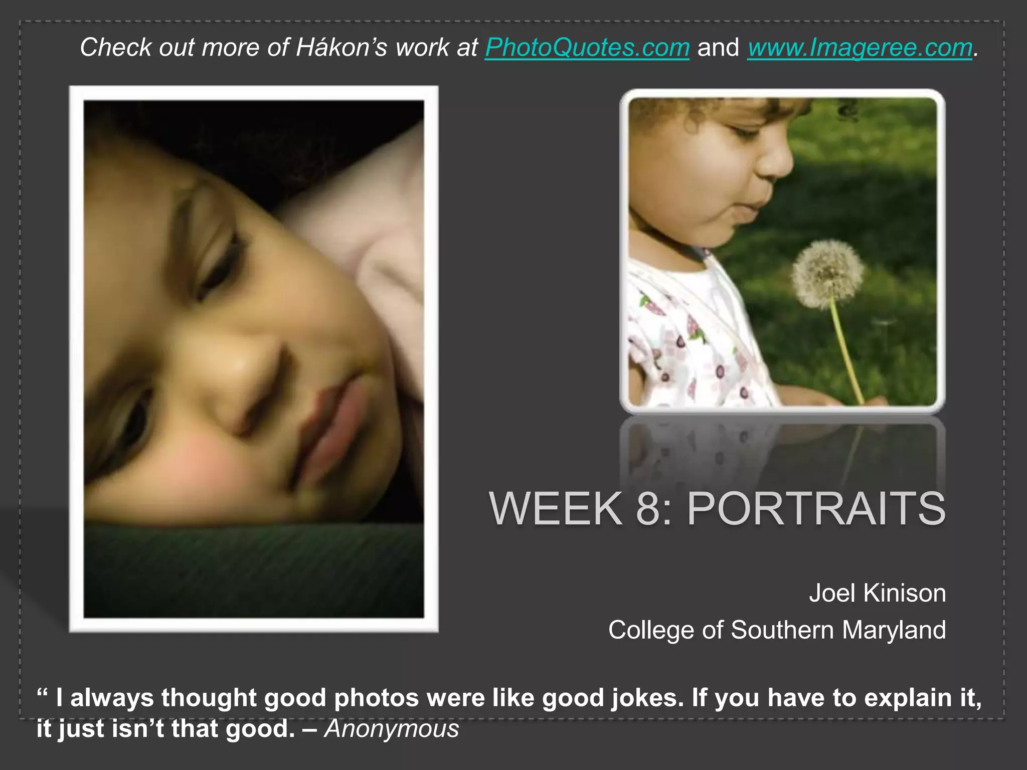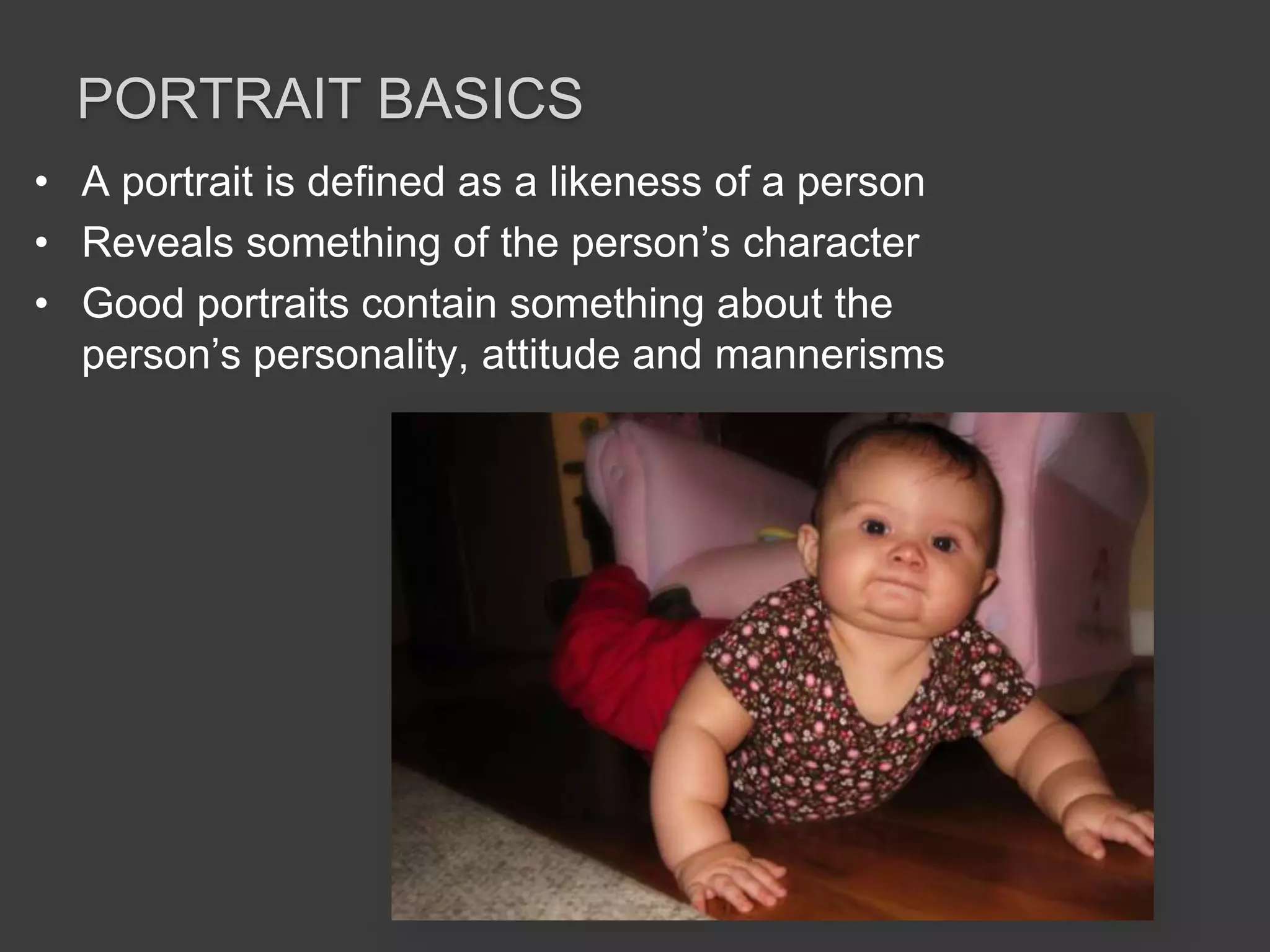 This document provides guidance on taking portrait photographs. It discusses composing formal portraits by making subjects comfortable, being in control as the photographer, and emphasizing the subject over backgrounds. It also offers tips for portraits outdoors and indoors, including considering lighting, backgrounds, and using techniques like depth of field and the rule of thirds. Specific advice is given for portraits of families, children, and in evening light. Throughout, it stresses focusing on the subject, avoiding distractions, finding fresh perspectives, and balancing elements in the frame.