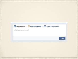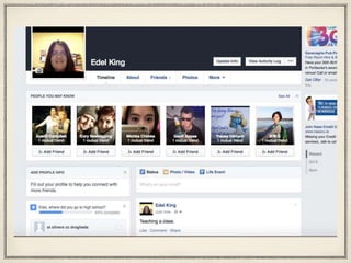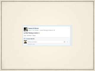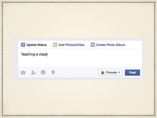This document provides instructions for using basic Facebook features like posting, liking, commenting, and adding friends. It explains how to create a post and add additional details like locations, activities, emotions, and tags for friends. Users can also like and comment on other people's posts. The document recommends practicing these skills before the next session, which will involve assessment and feedback.