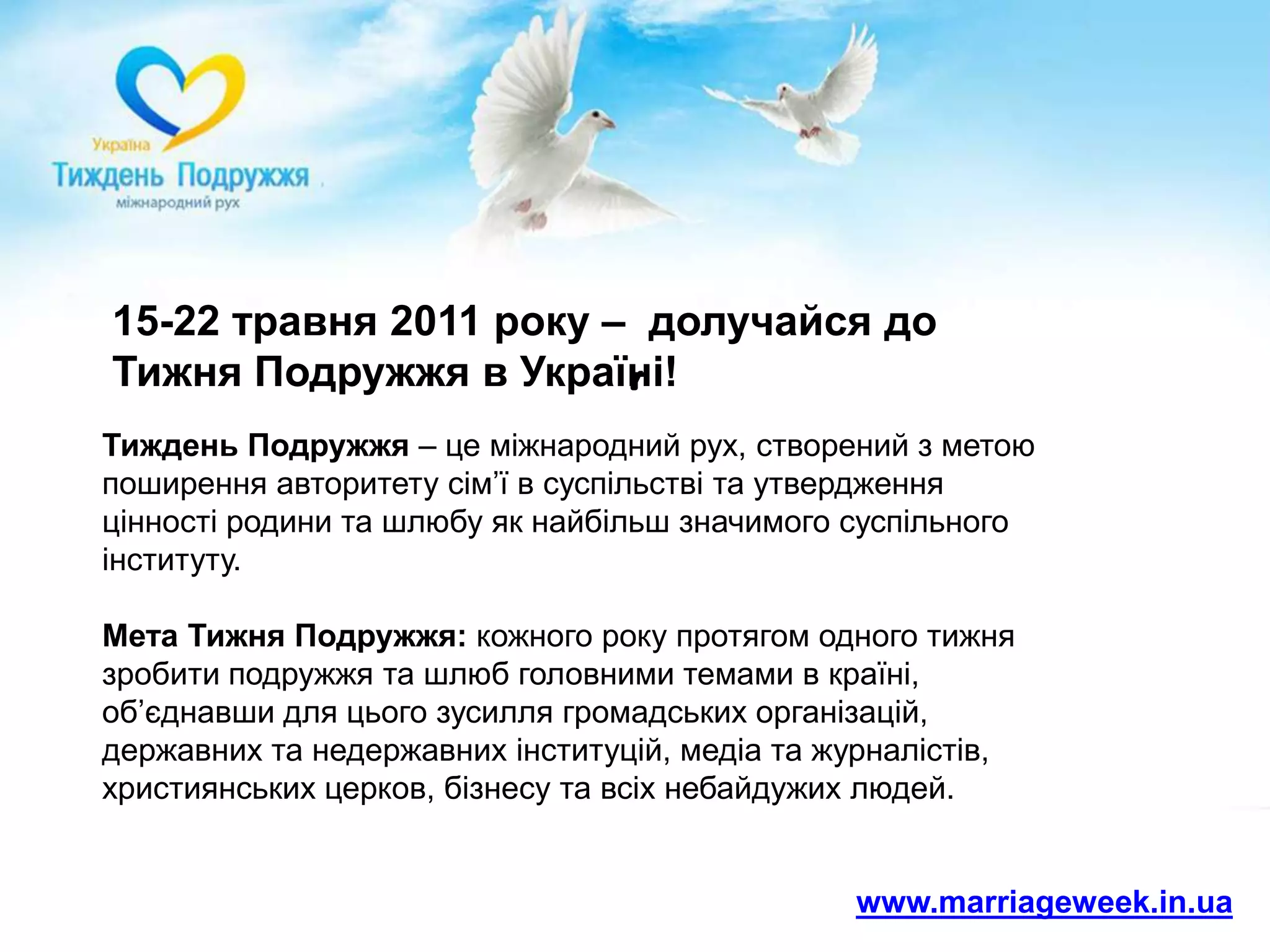‘15-22травня 2011 року– долучайся до Тижня Подружжя в Україні!Тиждень Подружжя – це міжнародний рух, створений з метою поширення авторитету сім’ї в суспільстві та утвердження цінності родини та шлюбу як найбільш значимого суспільного інституту.Мета Тижня Подружжя: кожного року протягом одного тижня зробити подружжя та шлюб головними темами в країні, об’єднавши для цього зусилля громадських організацій, державних та недержавних інституцій, медіа та журналістів, християнських церков, бізнесу та всіх небайдужих людей.www.marriageweek.in.ua
