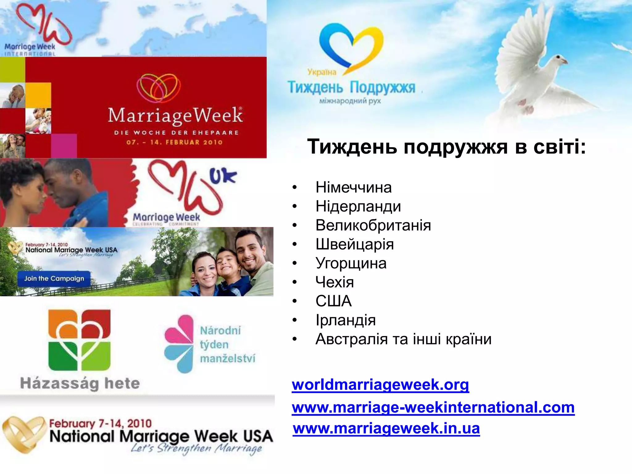 Тиждень подружжя всвіті:НімеччинаНідерландиВеликобританіяШвейцаріяУгорщинаЧехіяСШАІрландіяАвстралія та інші країниworldmarriageweek.orgwww.marriage-weekinternational.comwww.marriageweek.in.ua