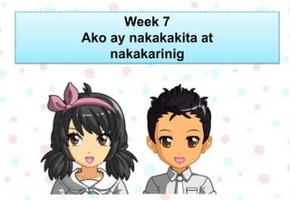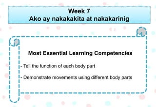 Ang dokumento ay naglalaman ng mga aktibidad para sa linggong 7 na nagtuturo tungkol sa mga bahagi ng katawan at kanilang mga tungkulin. Kabilang dito ang mga gawain sa pag-ugnay ng mga kulay, tunog, at paglikha ng mga larawan ng mukha batay sa kasarian. Ang mga ito ay nakatuon sa pagkilala at pag-unawa sa mga pandama at paggalaw ng katawan.