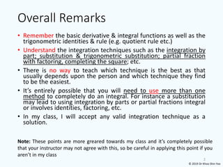 The document is a revision guide for engineering mathematics, specifically focusing on integration techniques, derivatives, trigonometric identities, and their applications. It discusses various integration methods such as substitution, integration by parts, and the importance of familiarity with derivative rules and trigonometric identities. Additionally, it emphasizes the flexibility of choosing appropriate techniques according to individual understanding and problem requirements.