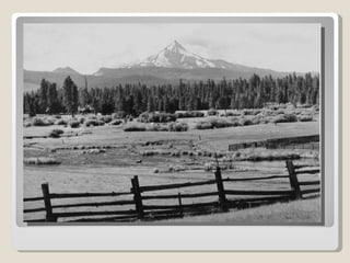 The document provides an overview and agenda for a landscape photography class. It discusses the history of landscape photography and photographers like William Henry Jackson. It also covers techniques like using rule of thirds, filling the frame, changing perspective, and framing. Tips are provided for different lighting conditions like sunrise, sunset, night, stars and storms. National Geographic photo contest winners are also mentioned. Students are assigned to capture the character of an area and post it on Flickr.