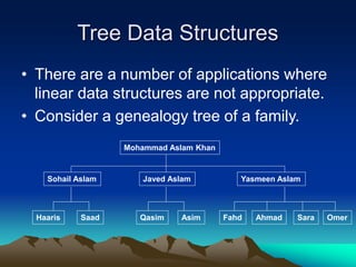 The document discusses various tree data structures, including binary trees and binary search trees. It provides definitions and examples of binary trees, their terminology like root, left/right subtrees, and tree traversal methods including preorder, inorder and postorder. It also discusses applications of binary search trees for searching, as well as operations on trees like inserting, deleting and traversing nodes.