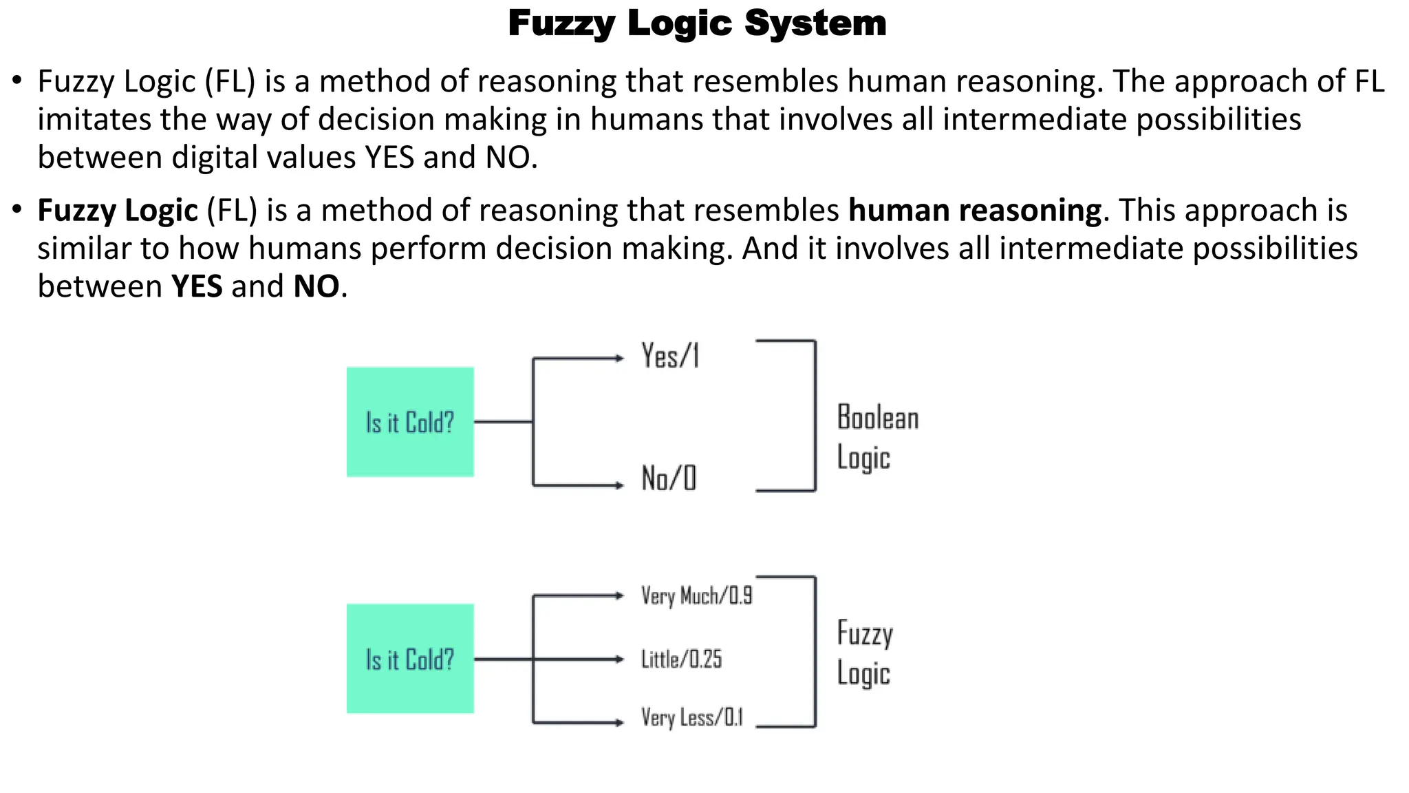 This document discusses fuzzy logic systems and their components and applications. It explains that fuzzy logic is a method of reasoning that resembles human reasoning and involves intermediate possibilities between binary values. The key components of a fuzzy logic controller include fuzzification, rules, an inference engine, and defuzzification. It provides examples of how fuzzy logic is used in various fields like aerospace, automotive, chemical processes, and artificial intelligence. The steps to design a fuzzy logic system are defined as identifying linguistic variables and terms, constructing membership functions, creating rule bases, and performing defuzzification.