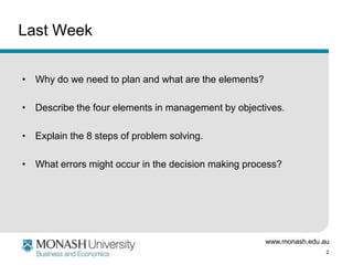 This document outlines the content and assignments for an Introduction to Management course. It discusses organizing and controlling last week's topics and reminds students that the case study assignment is due in Week 10. It provides instructions for an in-class activity where students must create a business in Nathaniskoolistan, selecting appropriate organizational structures and controls. The document concludes by advertising related course offerings and outlining the requirements for the second assignment, such as identifying problems, generating solutions, and using proper referencing for journal articles.