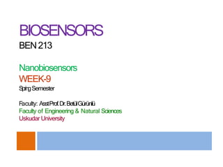 This document discusses topics that will be covered in a course on nanobiosensors, including the history and applications of biosensors, principles of molecular recognition and signal transduction, sources and design of biological recognition elements, modeling of reactions for various biosensor applications, modification of sensor surfaces and immobilization techniques, detection methods and physical sensors, fabrication of biosensors, and data acquisition and analysis. Examples of commercial biosensors and recent developments in new-generation nano-engineered biosensors are also mentioned.