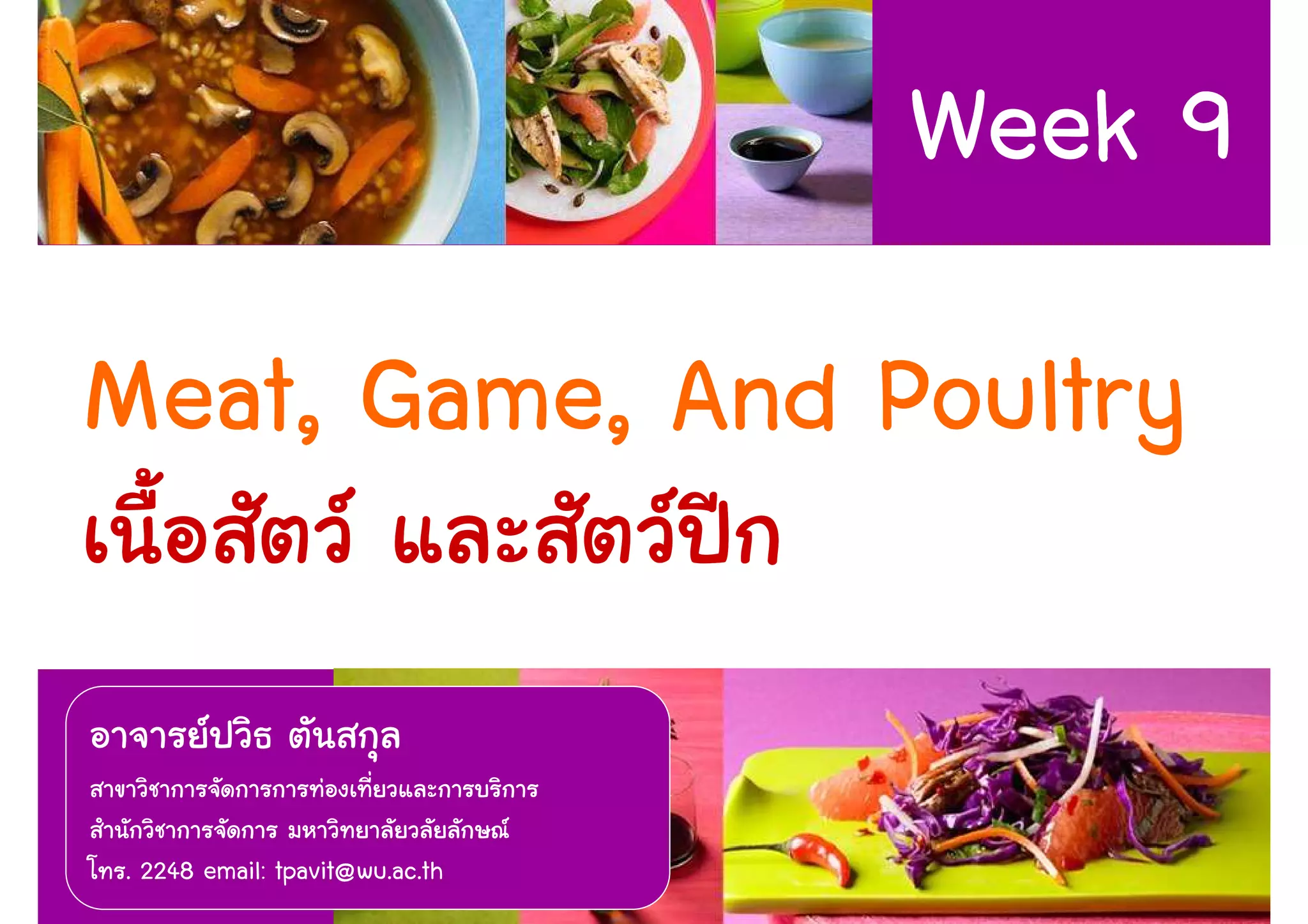 The document discusses various types of meats, poultry, and fish that are commonly consumed by humans. It covers the composition, structure, and cuts of beef, pork, lamb, poultry and fish. Key points include the main components of meat being water, protein and fat. It also discusses the muscle fiber structure, types of muscles, and connective tissues like collagen. The document provides information on cuts of beef, pork and lamb. It also summarizes common methods of cooking different types of meat, poultry and fish to the desired doneness.