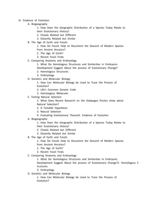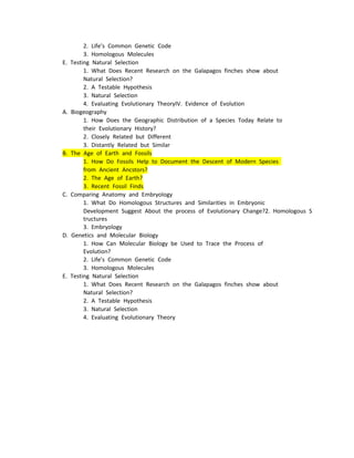 The document outlines evidence of evolution from biogeography, fossils, anatomy, embryology, genetics and molecular biology, and studies of natural selection. It discusses how the geographic distribution of species relates to their evolutionary history, the use of fossils to trace descent of modern species, homologous structures and similarities in embryonic development suggesting evolutionary change, molecular biology's ability to trace evolution, and how research on Galapagos finches shows natural selection in action.