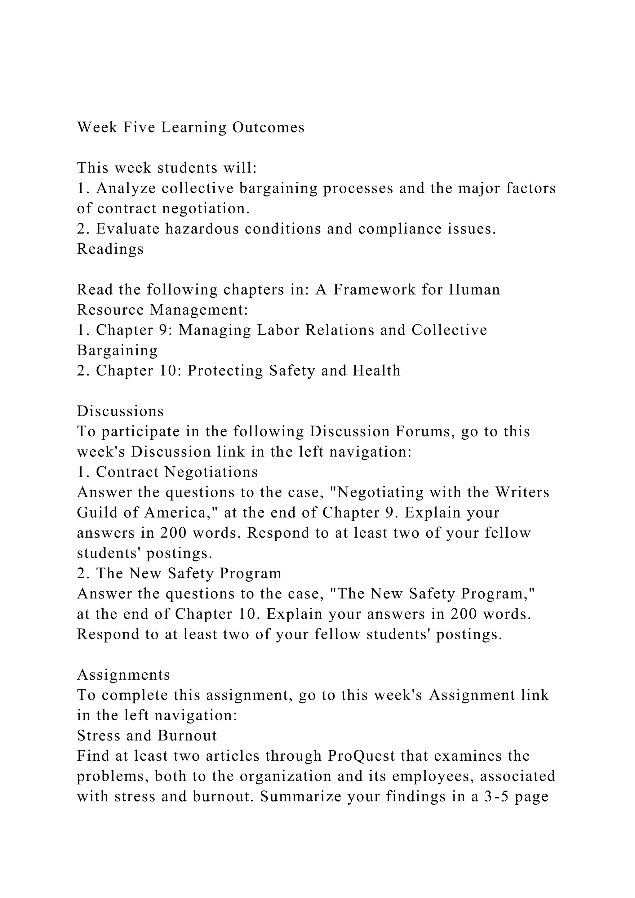 This week's learning outcomes focused on analyzing collective bargaining processes and contract negotiations as well as evaluating hazardous workplace conditions and compliance issues. Students were assigned readings on labor relations, collective bargaining, and workplace safety and health. They were to participate in online discussions about contract negotiations and a new safety program. Additionally, students had to write a 3-5 page paper summarizing findings from articles on stress and burnout in the workplace. The instructor provided guidance on labor relations, collective bargaining, workplace safety, and warning signs of troubled employees.