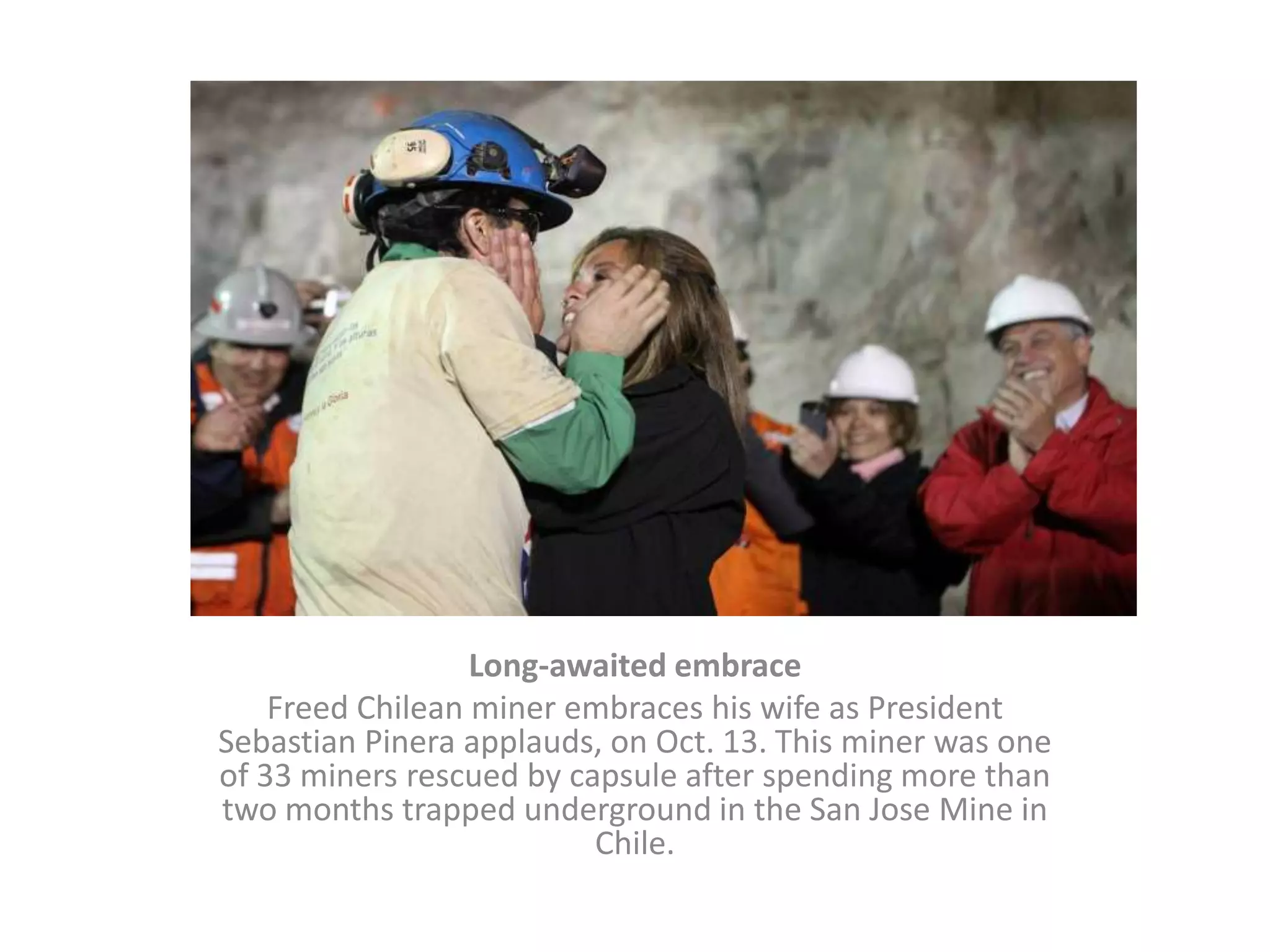 The document contains 6 short news stories: 1) A freed Chilean miner embraces his wife after being rescued from a collapsed mine. 2) Over 1 million Catholics in Brazil participate in a religious procession honoring a local saint. 3) A Kyrgyz woman and her son pick cotton in a field near their village. 4) A frog floats among cranberries awaiting harvest on a cranberry bog in Massachusetts. 5) Angry crowds in Bangladesh attack and burn a train that struck and killed three people, requiring police to fire rubber bullets and tear gas to disperse the protesters. 6) A pug wears lederhosen during a visit to Munich's Oktoberfest celebration.