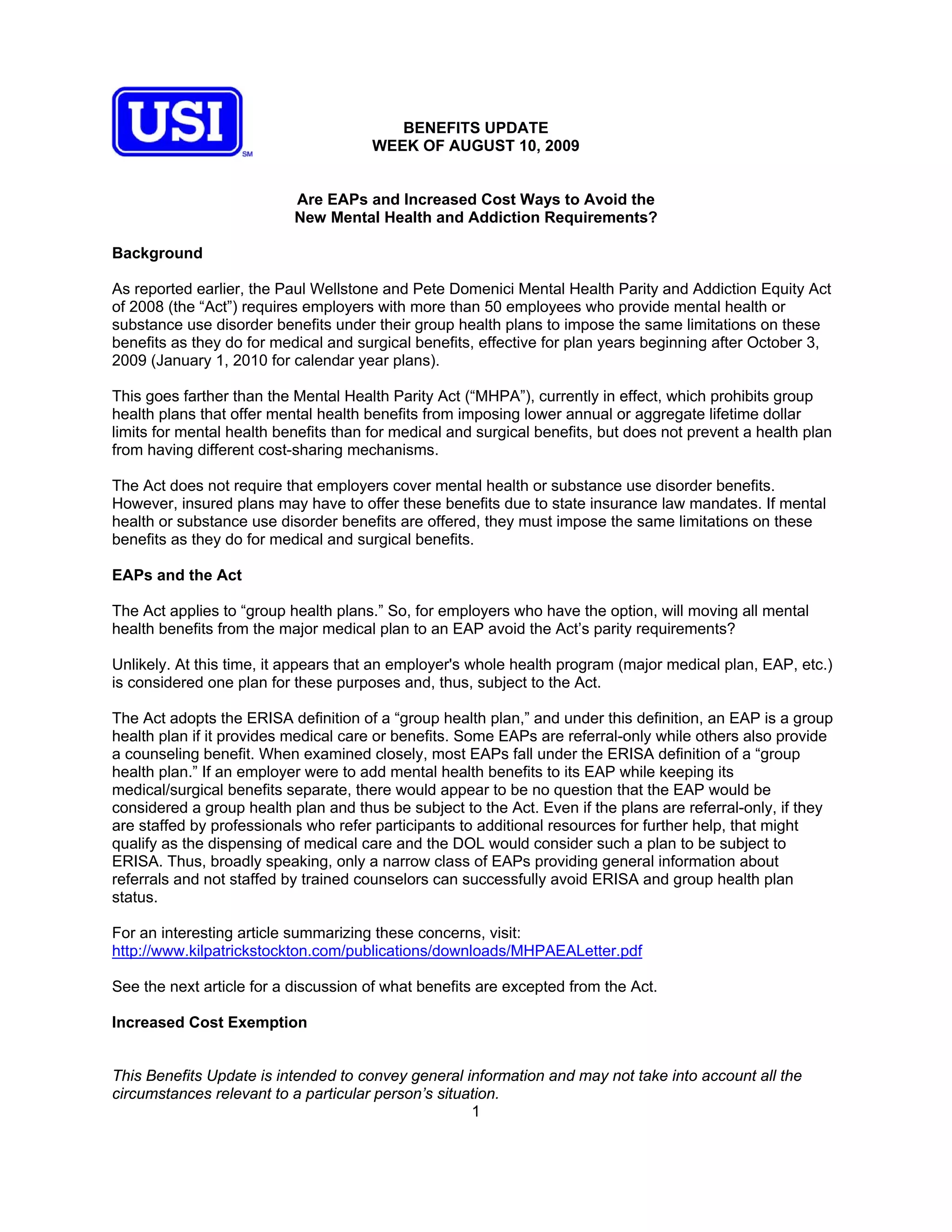 This document discusses the implications of the Mental Health Parity and Addiction Equity Act of 2008 for employer-provided health plans. It addresses whether moving mental health benefits to an employee assistance program (EAP) would avoid the Act's requirements and analyzes different types of excepted benefits that are not subject to the Act. The document also outlines potential cost exemptions and opt-out provisions for certain self-funded government plans.