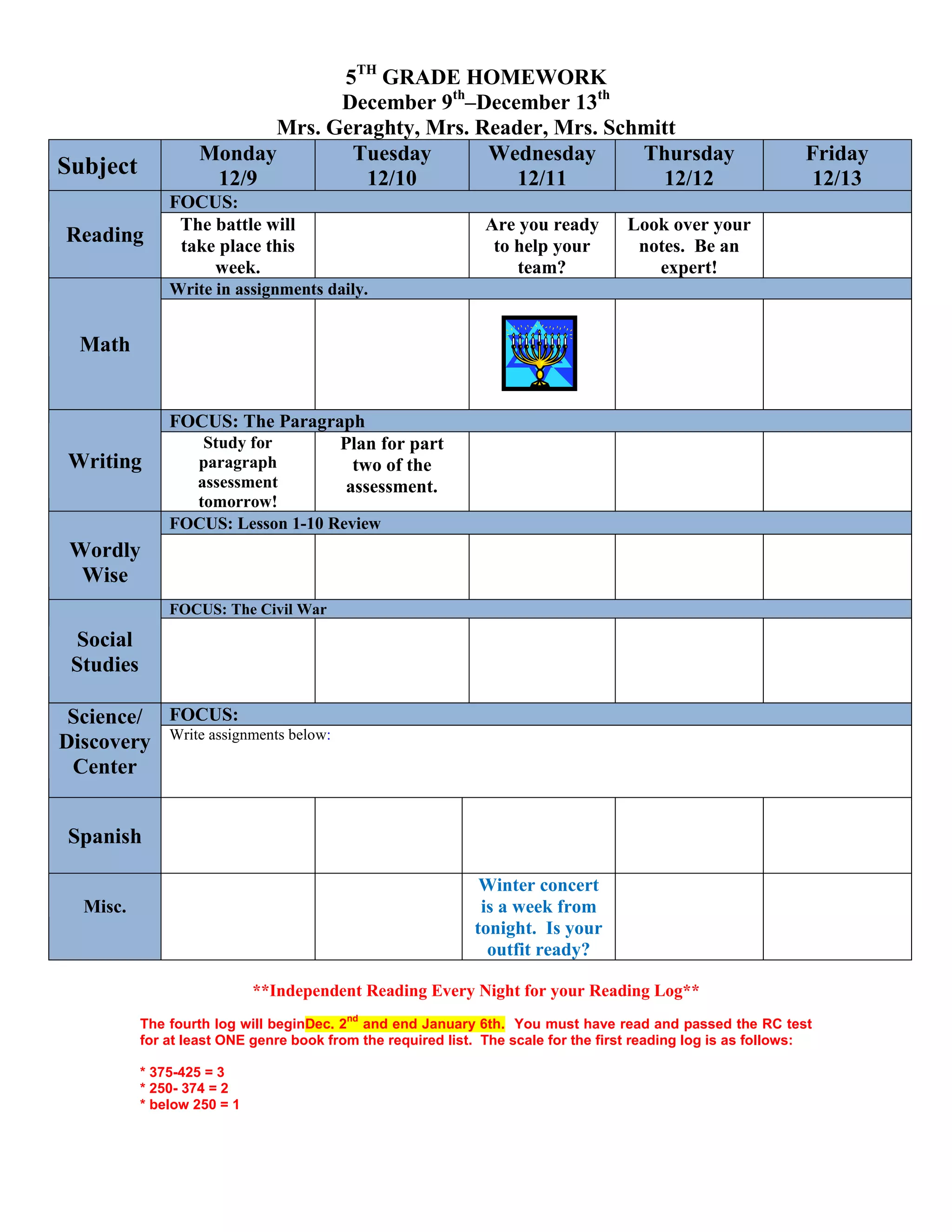 The document provides a weekly homework schedule for 5th grade students from December 9th to December 13th. It includes assignments for reading, math, writing, wordly wise, social studies, science/discovery center, Spanish, and independent reading. Students are to complete reading, math, and writing assignments daily. They have assessments in reading on paragraphs and in social studies on the Civil War. They also need to prepare for the winter concert and complete their fourth reading log by reading from a required genre and passing a reading comprehension test.