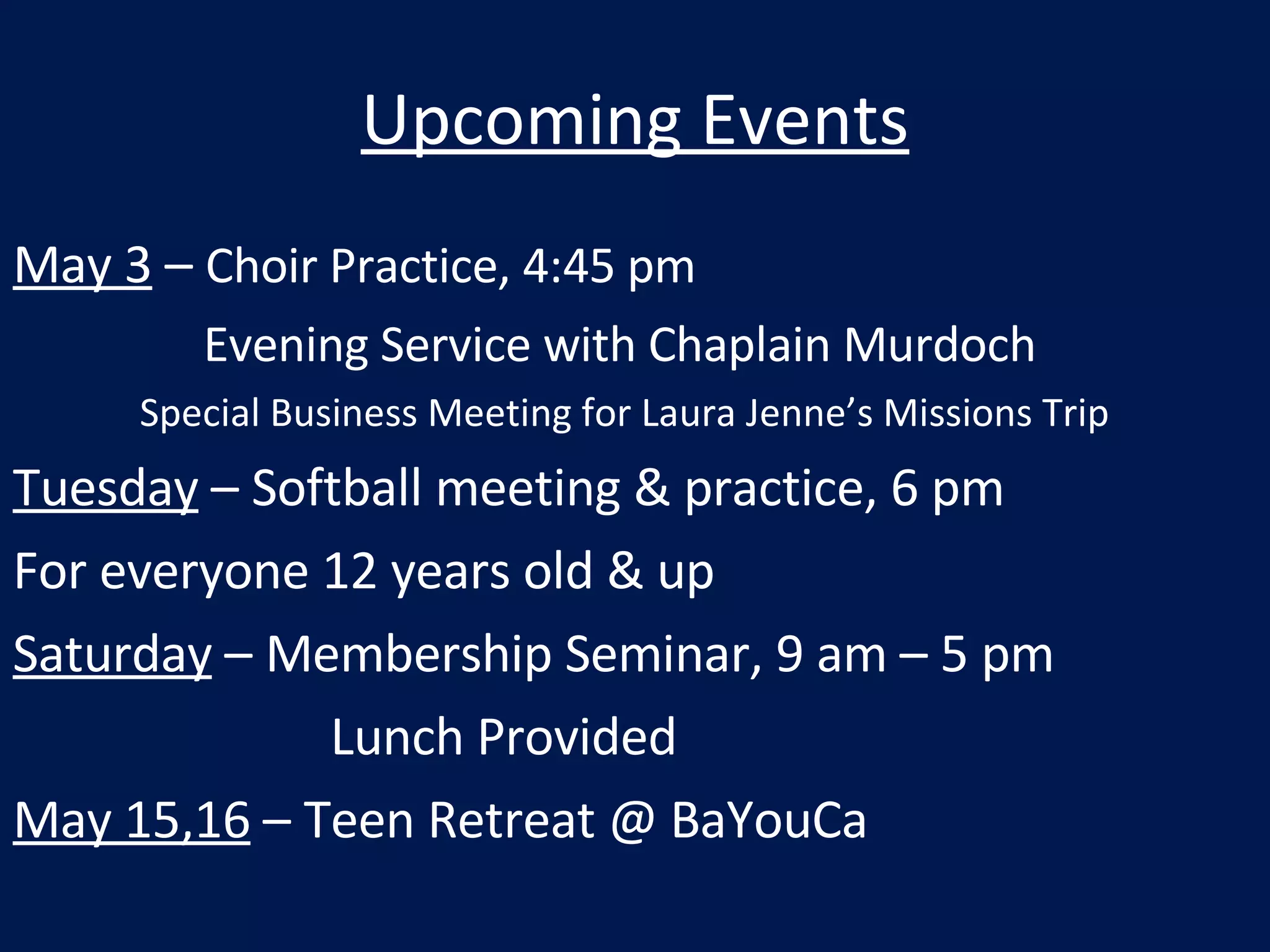 The document provides information about upcoming events at a church including choir practice, a business meeting, softball practice and games, seminars, retreats, and mission trips. It also lists the schedule for Sunday night services and formats, needs for fellowship time supplies, youth ministry activities, men's ministry gatherings, a children's choir practice, life groups for different demographics, adult bible study classes, and prayer requests including missionaries and public servants.