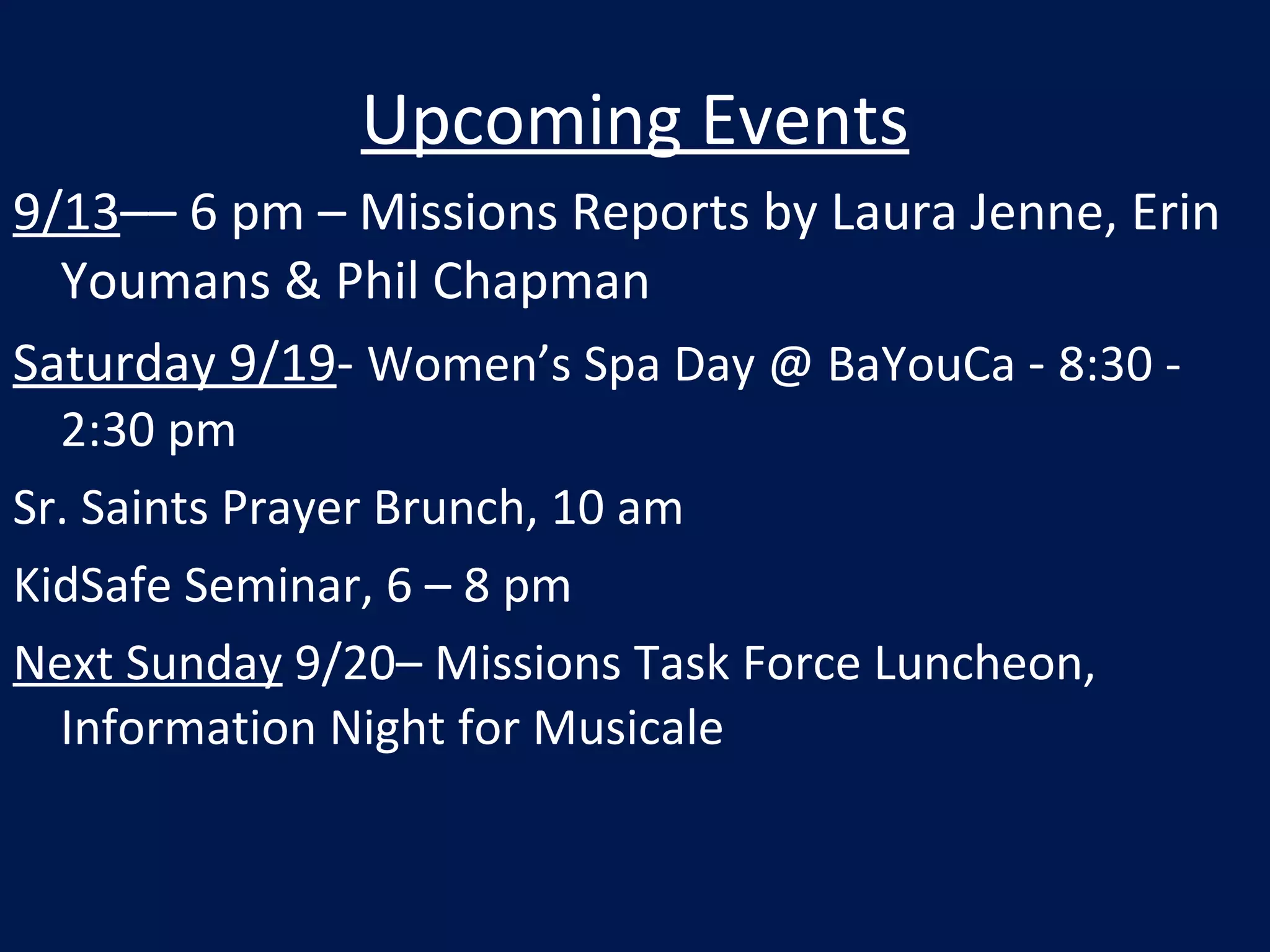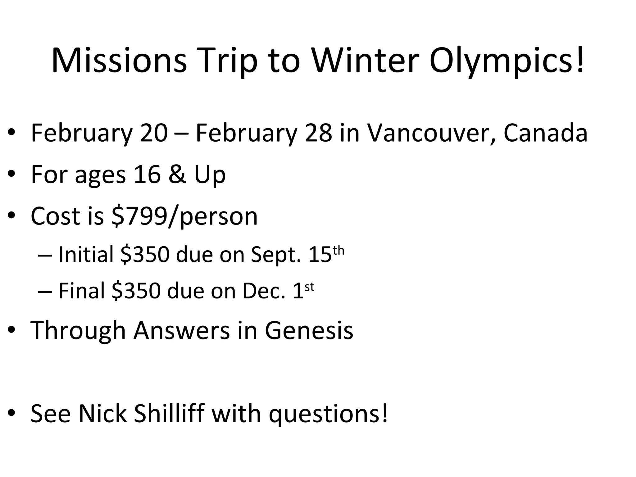 Upcoming events at the church over the next month include mission reports, a women's spa day, prayer brunches, and seminars. A missions trip to the Winter Olympics in Vancouver, Canada is also announced for ages 16 and up. Sunday evening services are returning to a normal format of studying "In the Dust of the Rabbi". Various youth, women's, and men's ministry events are listed, including gatherings, workshops, retreats, and coffee houses. Volunteers are needed to collect items for Christmas packages to be sent to troops. New adult Bible study classes are beginning and LIFE groups are advertised. An informational meeting is scheduled for an upcoming Christmas musicale.