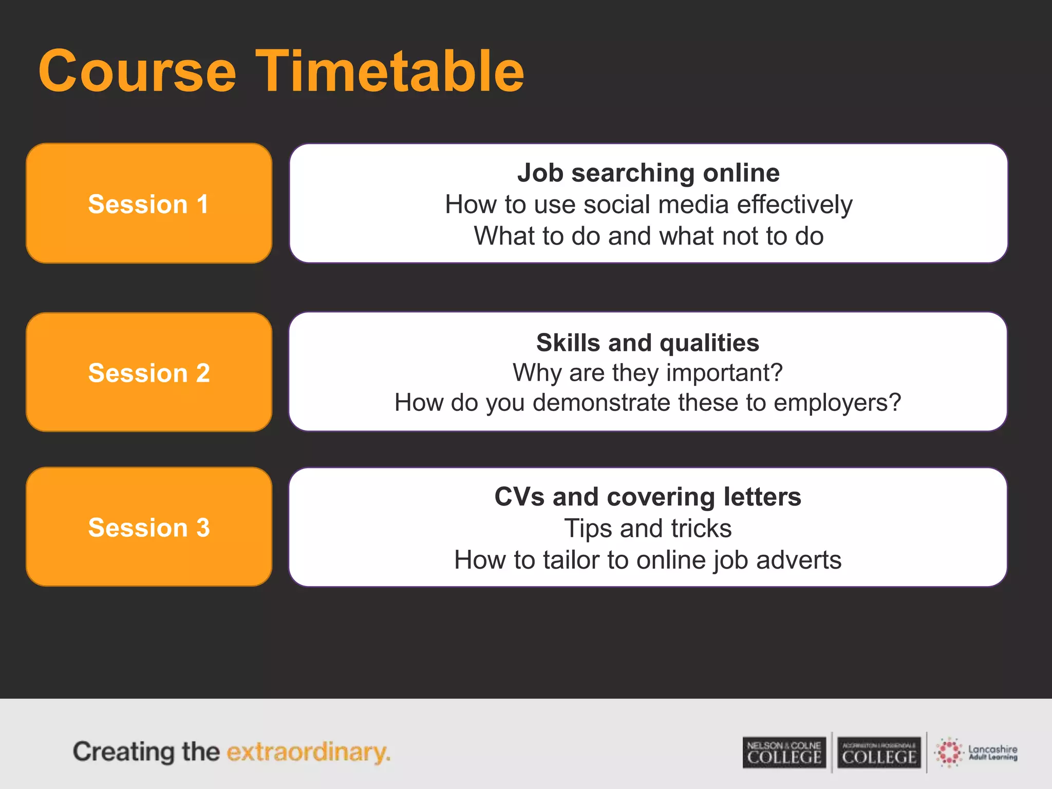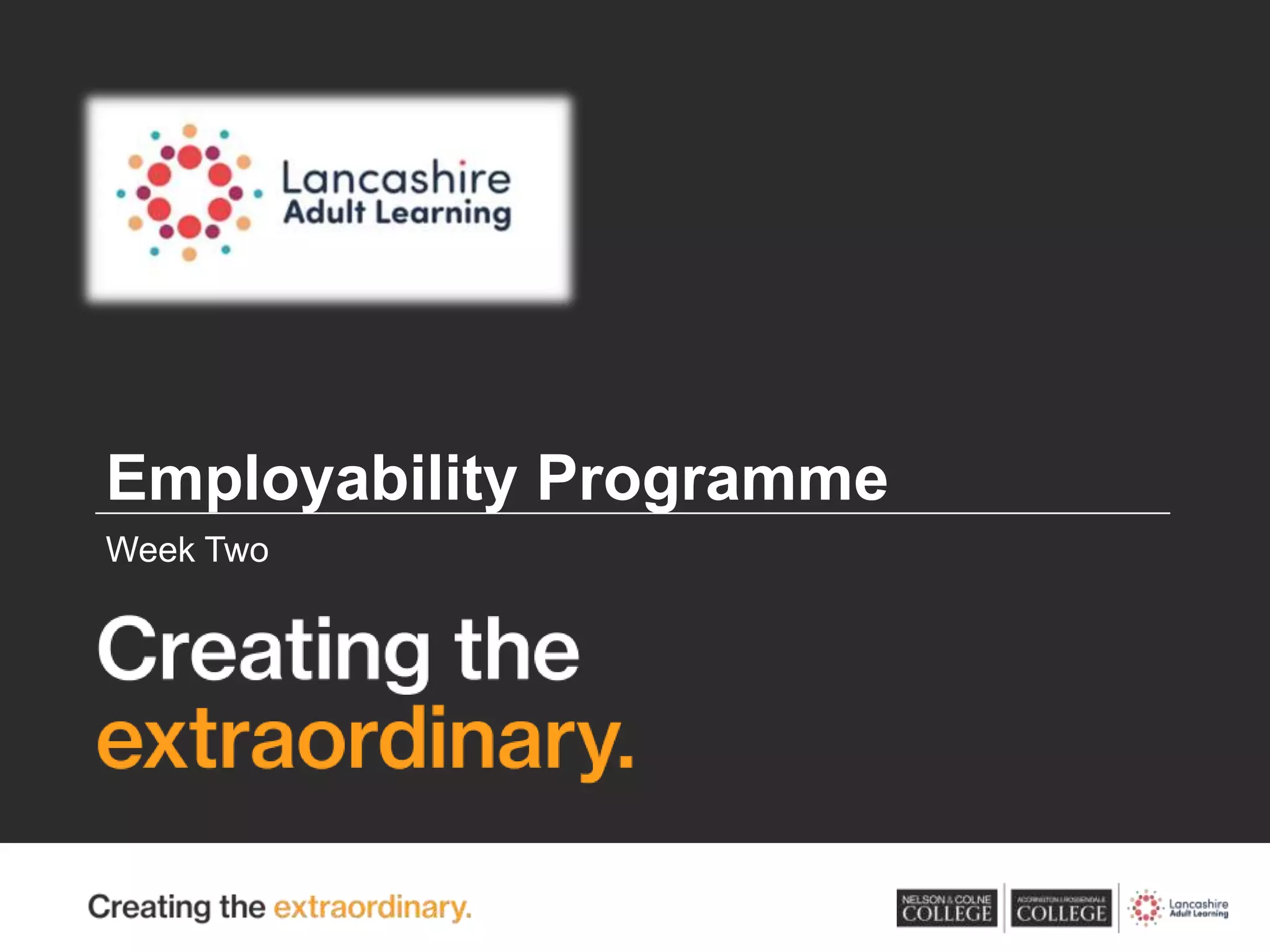 The document outlines the sessions and tasks for an employability programme over two weeks. Week one covers job searching skills like using social media and tailoring CVs and cover letters for online applications. Participants complete an initial assessment and set a goal. Week two focuses on online applications, interview skills and qualifications. Tasks include reviewing social media profiles, finding local jobs boards, defining skills and qualities, identifying transferable skills from previous roles like cabin crew, and doing a SWOT analysis for retraining. Today's tasks are to familiarise with the Moodle platform and complete a skills and attributes exercise.