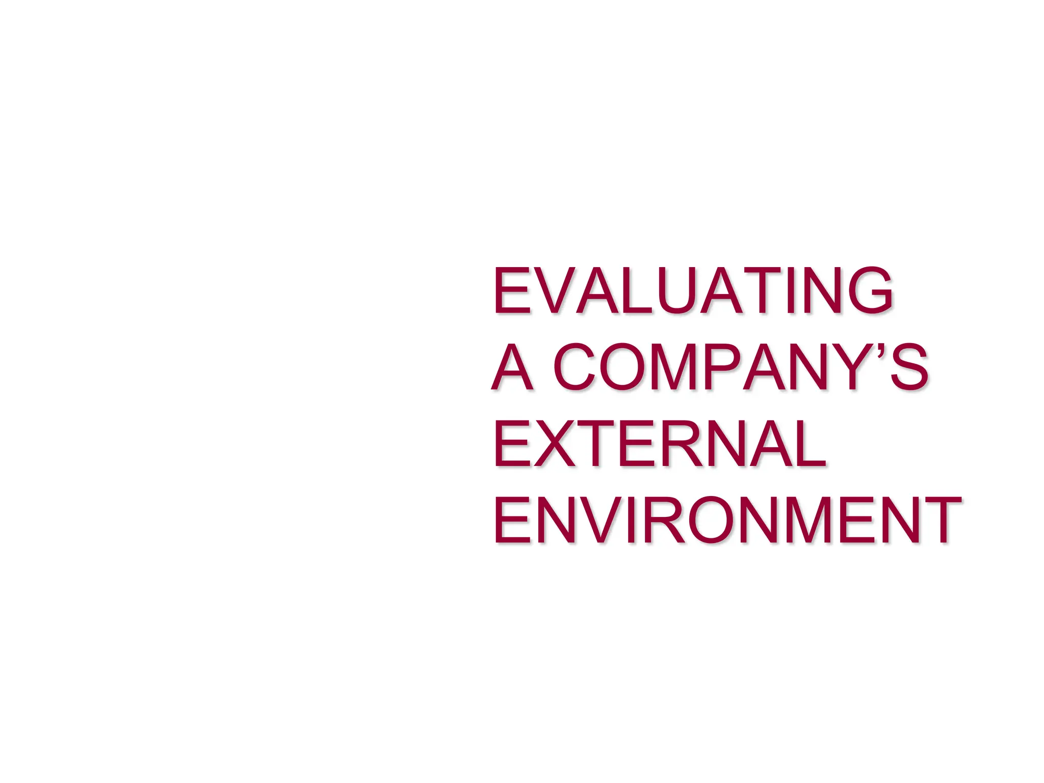 This document discusses evaluating a company's external environment by assessing its industry and competitive conditions. It outlines 7 steps for evaluating the industry: 1) analyzing dominant economic characteristics, 2) assessing competitive forces using Porter's 5 Forces model, 3) identifying drivers of industry change, 4) analyzing competitor positions, 5) anticipating competitor strategies, 6) determining success factors, and 7) evaluating industry profitability outlook. Porter's 5 Forces model examines the competitive threats from buyers, suppliers, substitutes, potential entrants and industry rivals. The document provides questions to consider for each step of the industry evaluation.