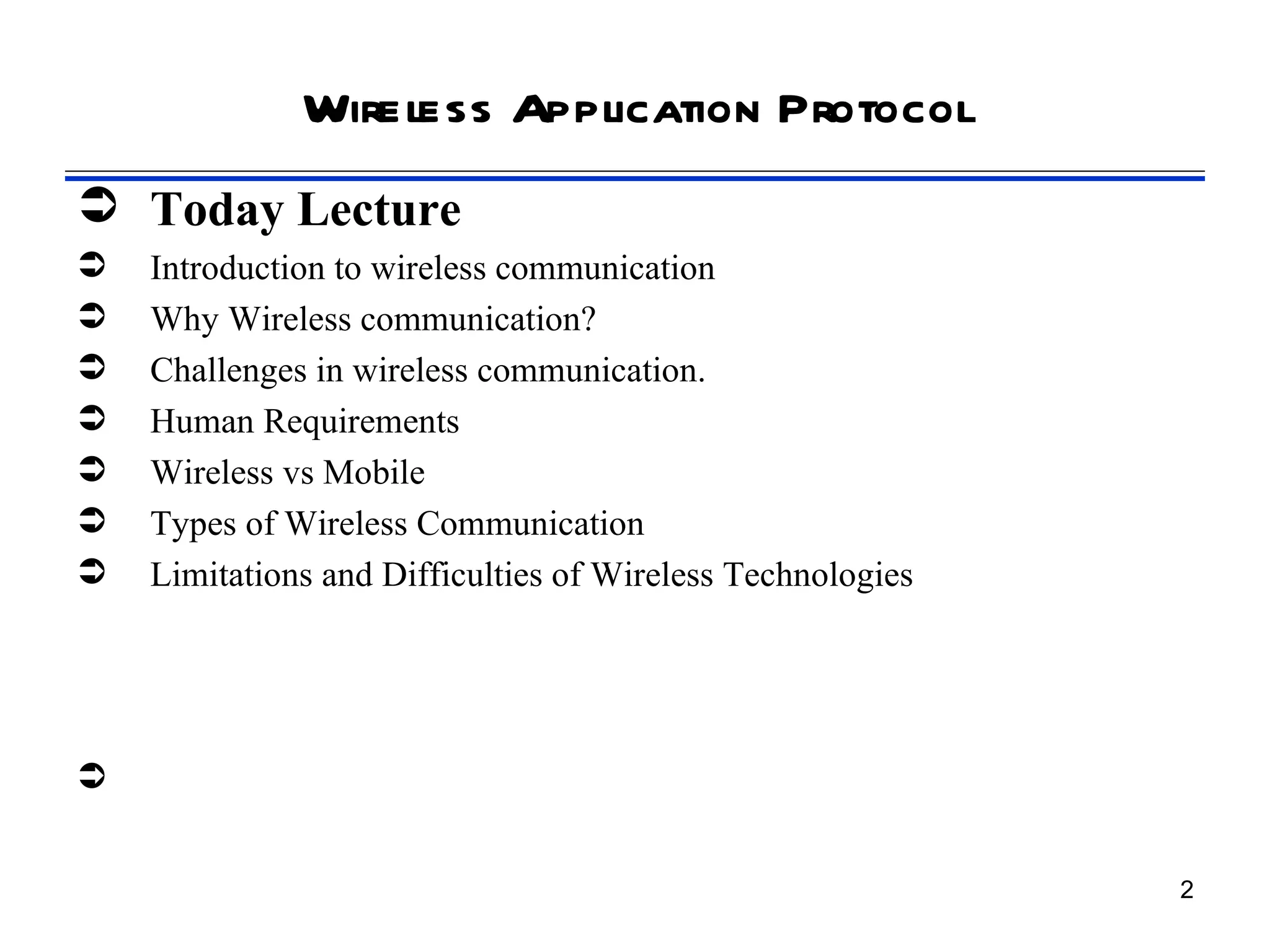 This document provides an introduction to wireless communication and wireless application protocol (WAP). It discusses the benefits of wireless communication like freedom from wires and global coverage. It also covers some of the technical challenges in wireless communication like efficient use of spectrum, mobility support, and maintaining quality of service over unreliable links. It defines wireless communication and differentiates between wireless and mobile. It also describes various types of wireless technologies and their limitations.