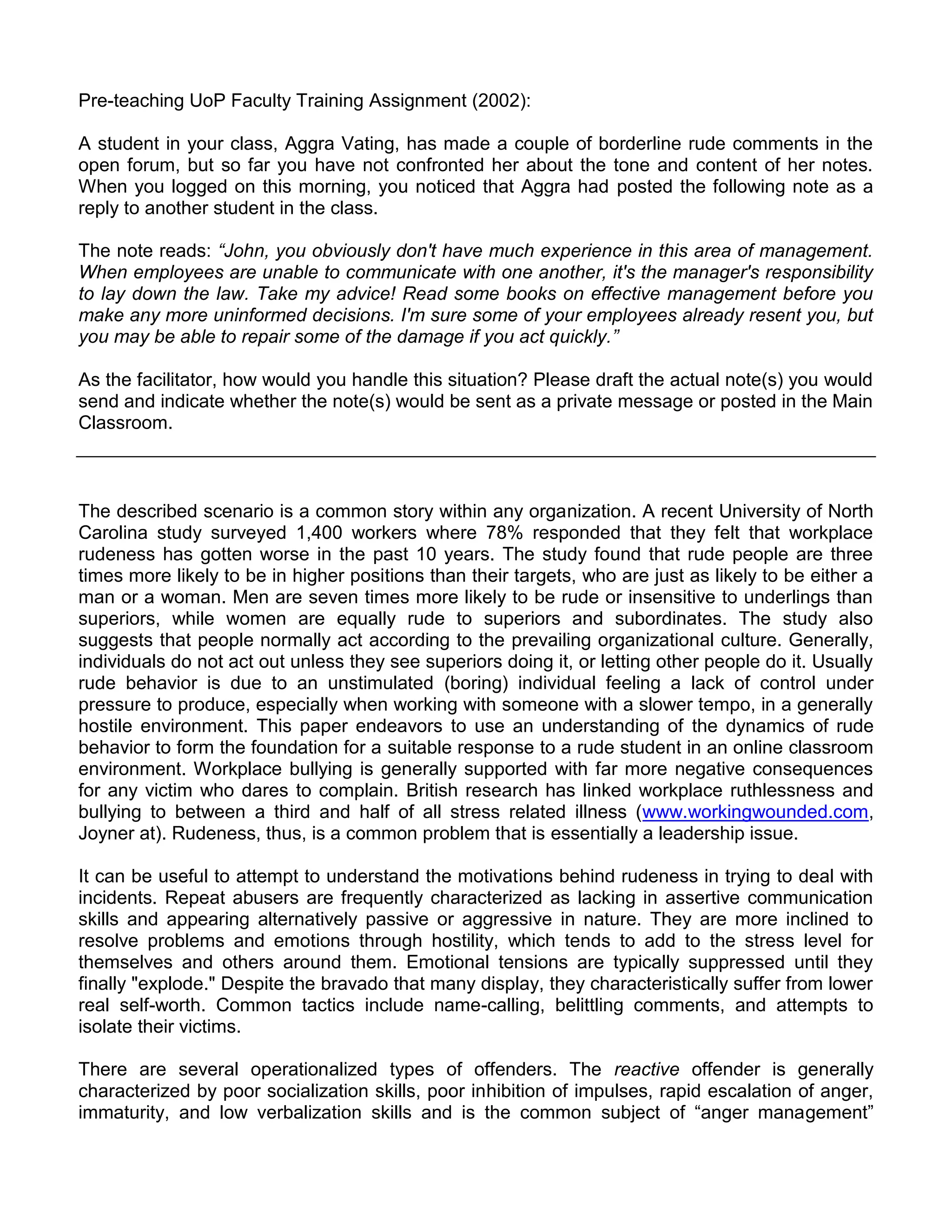 The document discusses how to handle rudeness in an online classroom environment, emphasizing that rudeness is a leadership issue influenced by organizational culture. It outlines different types of offenders and victim responses while suggesting strategies for instructors to address rude behavior constructively and positively. Furthermore, it advocates for using negotiation and mutual gains approaches to resolve conflicts and improve interpersonal relationships within the educational setting.