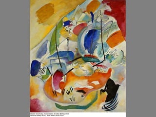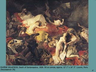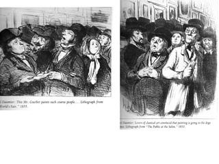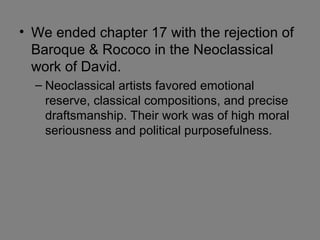 The document discusses the evolution of art movements from neoclassicism to post-impressionism, highlighting key principles and artists associated with each movement. It emphasizes the transition from emotional reserve in neoclassical art to the expressive, individualistic nature of romanticism and realism, culminating in the impressionist techniques focusing on light and color. Ultimately, the document illustrates how art reflects societal changes and individual perspectives from the late 18th century to the early 20th century.