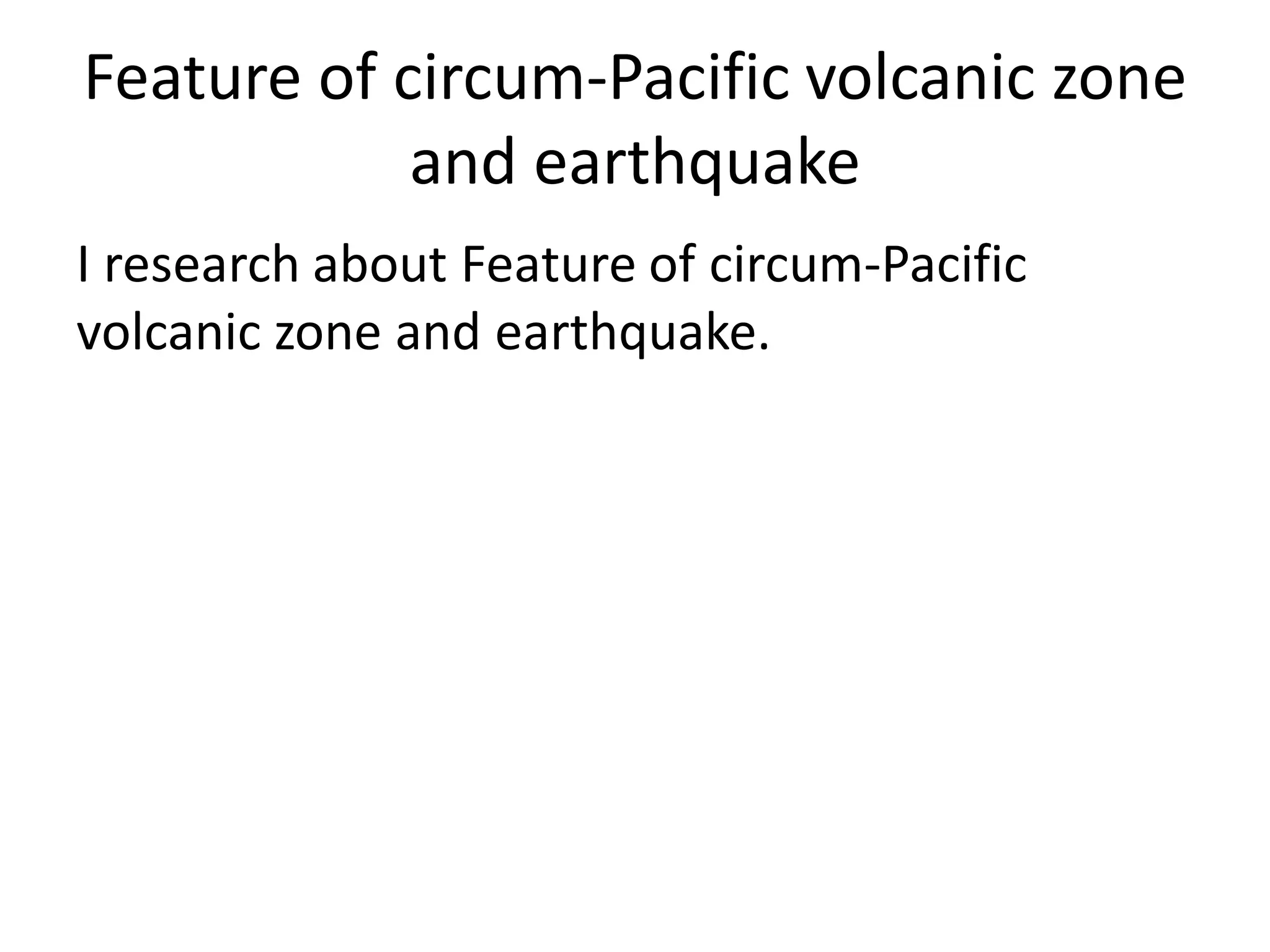 The document discusses features of earthquakes in circum-Pacific volcanic zones. Specifically, it notes that earthquakes in these zones tend to have epicenters located directly above where tectonic plates collide under the sea. Additionally, large earthquakes often occur in areas where stress has built up. Detailed surveys of the ground can confirm small earthquake activity in regions with accumulated stress. This earthquake mechanism is similar to stress buildup and cracking that occurs when pressing on a plastic sheet laid under paper.