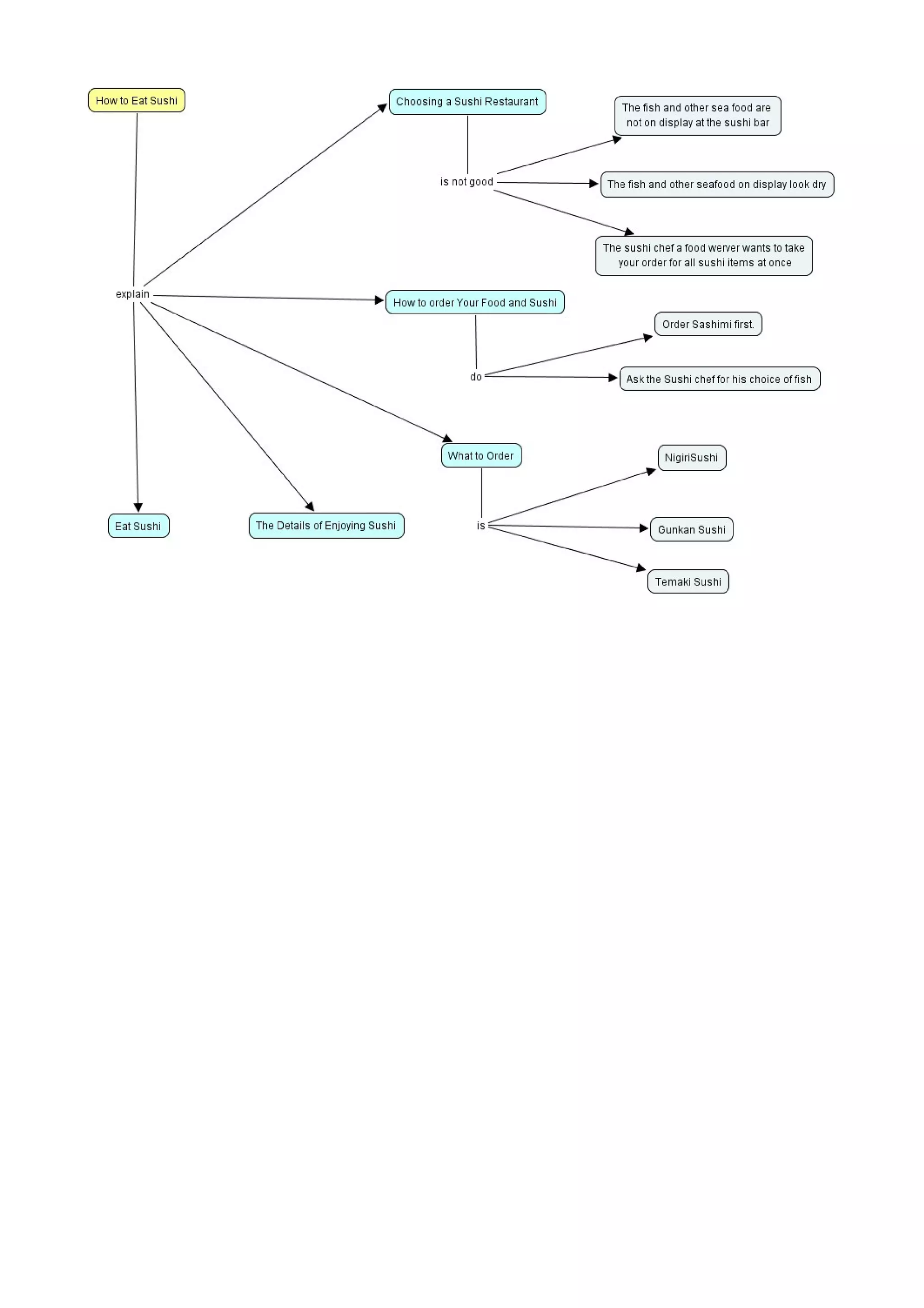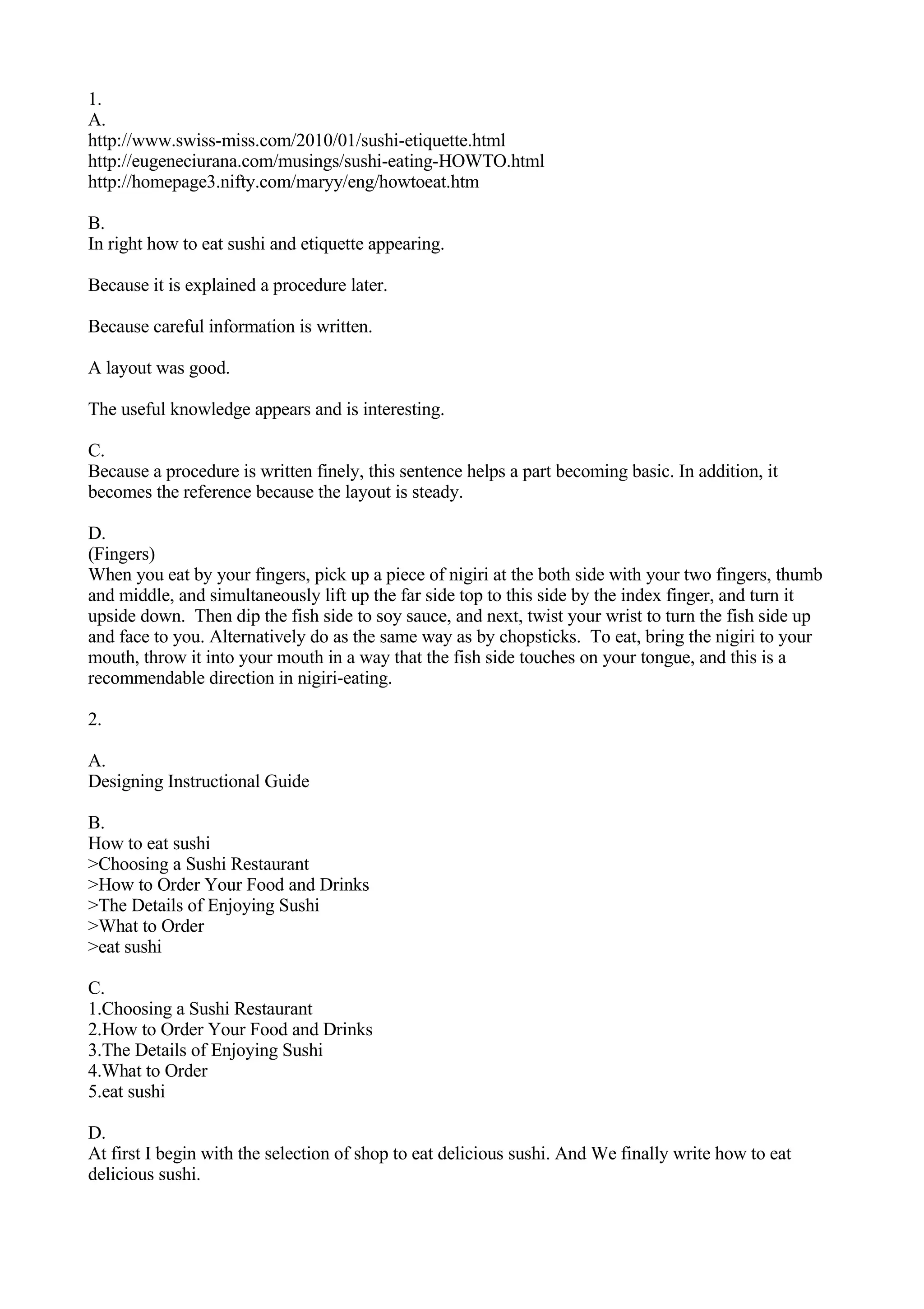 This document provides instructions for proper sushi etiquette and how to eat different types of sushi. It discusses picking up nigiri sushi with fingers and dipping the fish side in soy sauce before eating. It also outlines topics to include when designing an instructional guide on how to eat sushi, such as choosing a restaurant, ordering, and enjoying sushi. The guide would explain the details of eating sushi in a clear five-step structure.