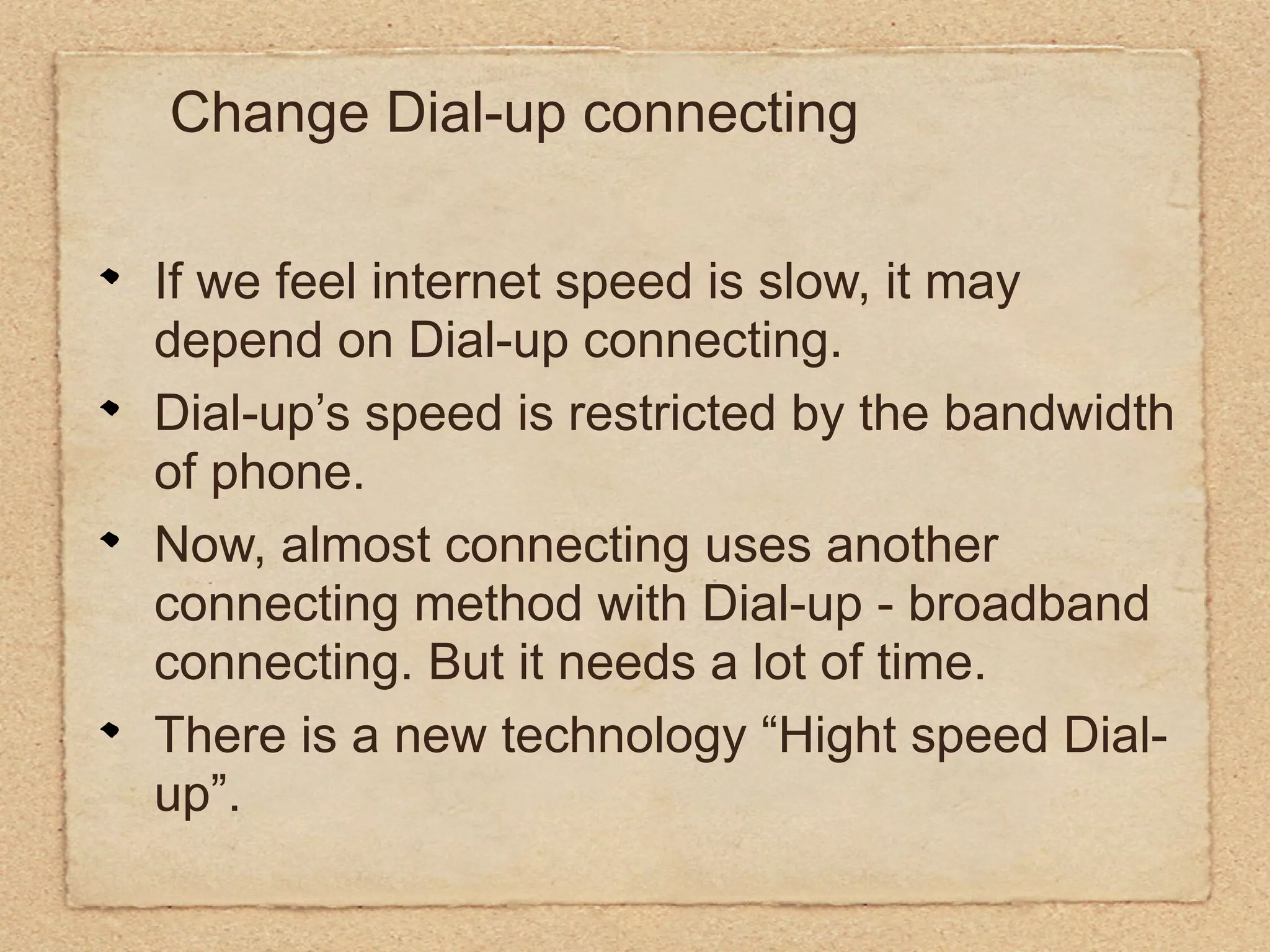 High speed dial-up aims to improve internet speeds for traditional dial-up connections. It uses several techniques like reducing handshake steps, compressing files, filtering advertisements, and caching previously visited web pages to cut down on communication time. An experiment showed that a high speed dial-up provider called NetZero was three times faster than standard dial-up connections.