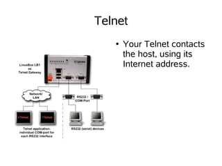 Telnet allows users to connect their computer to a remote computer over the internet and interact with it as if their local computer was directly connected to the remote system. It uses terminal emulation to determine how keyboard inputs and screen outputs will work across the connection. The telnet protocol assumes both the client and server can act as network virtual terminals to allow for remote terminal sessions over the internet.