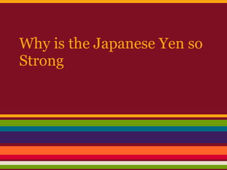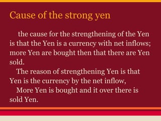 The Japanese yen has strengthened over the past 20 years due to it being a currency with net inflows. More yen are bought than sold, leading to increased demand. This strengthening tendency is reinforced further by low returns on investments in other countries' foreign reserves, Japan's trade surplus, and monetary policies in the US and Europe. Historically, the yen has fluctuated but the overall pattern has been for it to grow stronger against the dollar. The strength of a currency is driven by balances of supply and demand - when demand exceeds supply, as it does currently for the yen, the currency strengthens in value.