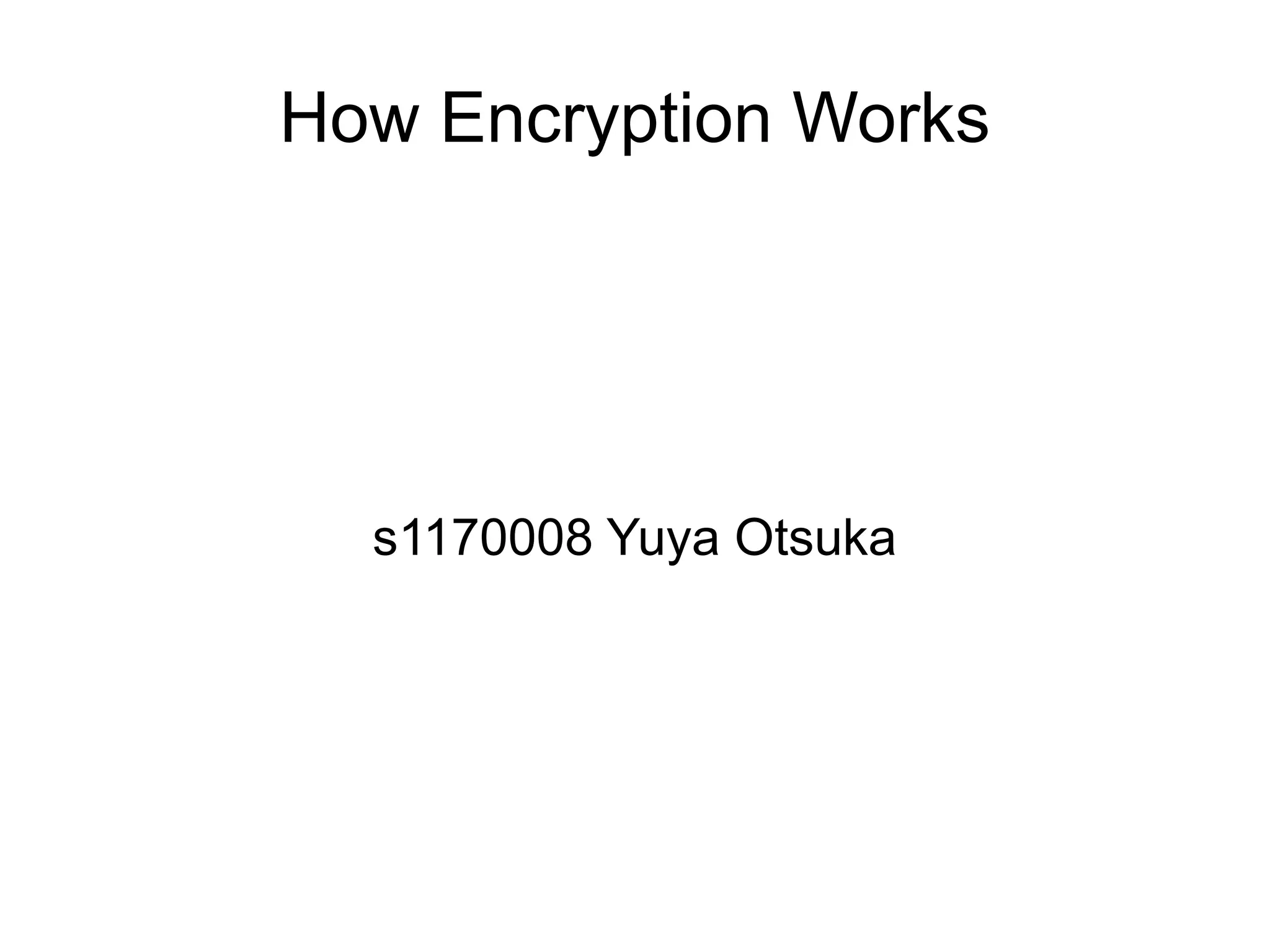 Encryption works by using keys to scramble and unscramble data during transmission. Symmetric key encryption uses a single secret key shared between computers, while public key encryption uses two keys - a private key known only to the sending computer and a public key given to computers wanting secure communication. Common encryption protocols like SSL and TLS allow sensitive information to be securely transmitted on the internet by authenticating users and encrypting data between web browsers and servers.