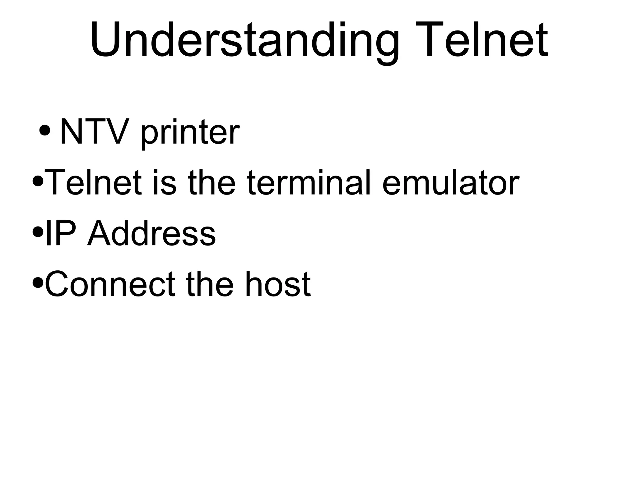 Telnet is a terminal emulation protocol that uses TCP to establish connections between clients and servers, allowing clients to connect to remote hosts. It negotiates how the client and server will communicate over the internet. An IP address is a numerical identifier assigned to devices on a network using the Internet Protocol to communicate between nodes.