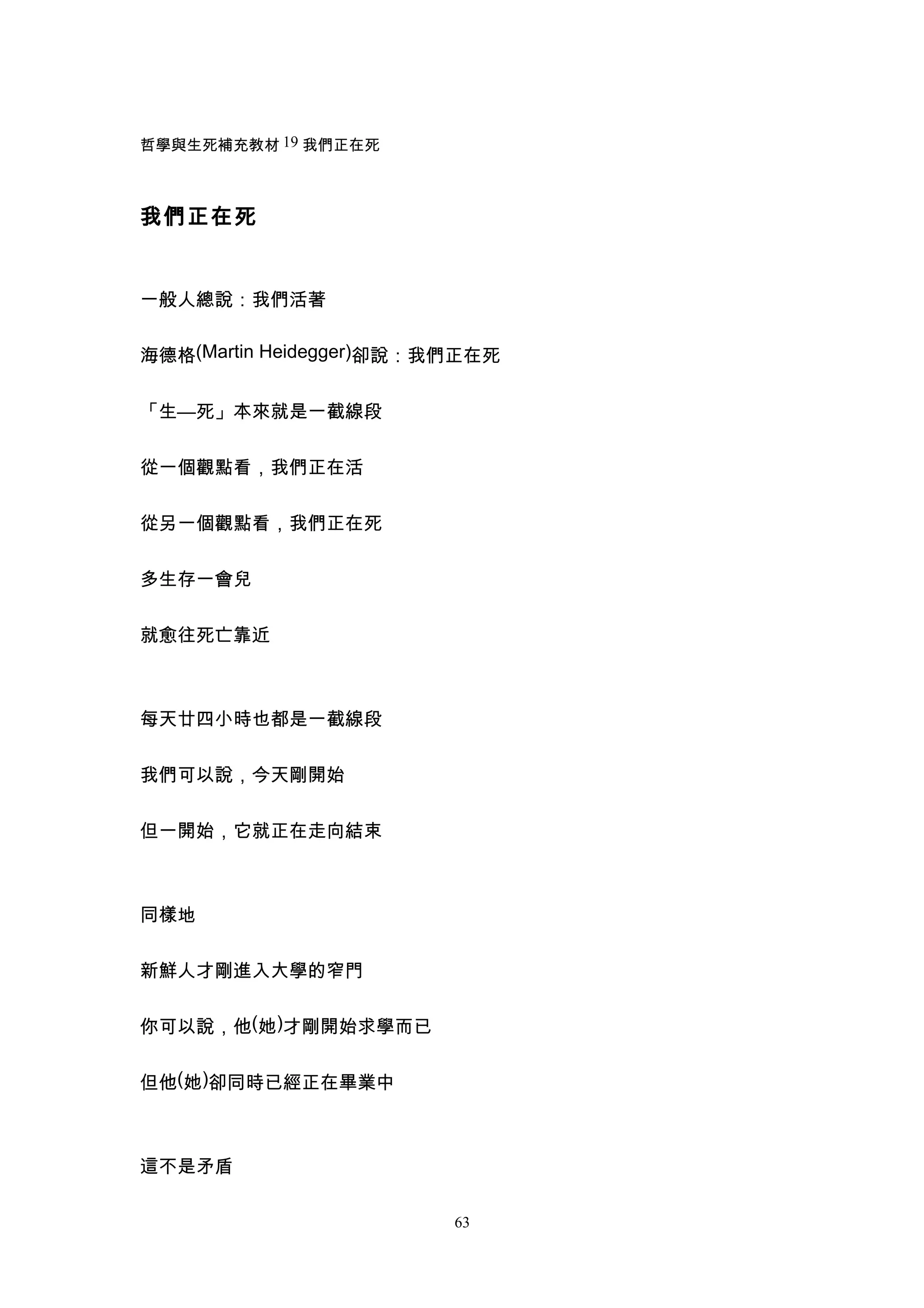 Heidegger)卻說:我們正在死 「生—死」本來就是一截線段 從一個觀點看,我們正在活 從另一個觀點看,我們正在死 多生存一會兒 就愈往死亡靠近 每天廿四小時也都是一截線段 我們可以說,今天剛開始 但一開始,它就正在走向結束 同樣地 新鮮人才剛進入大學的窄門 你可以說,他(她)才剛開始求學而已 但他(她)卻同時已經正在畢業中 這不是矛盾 63