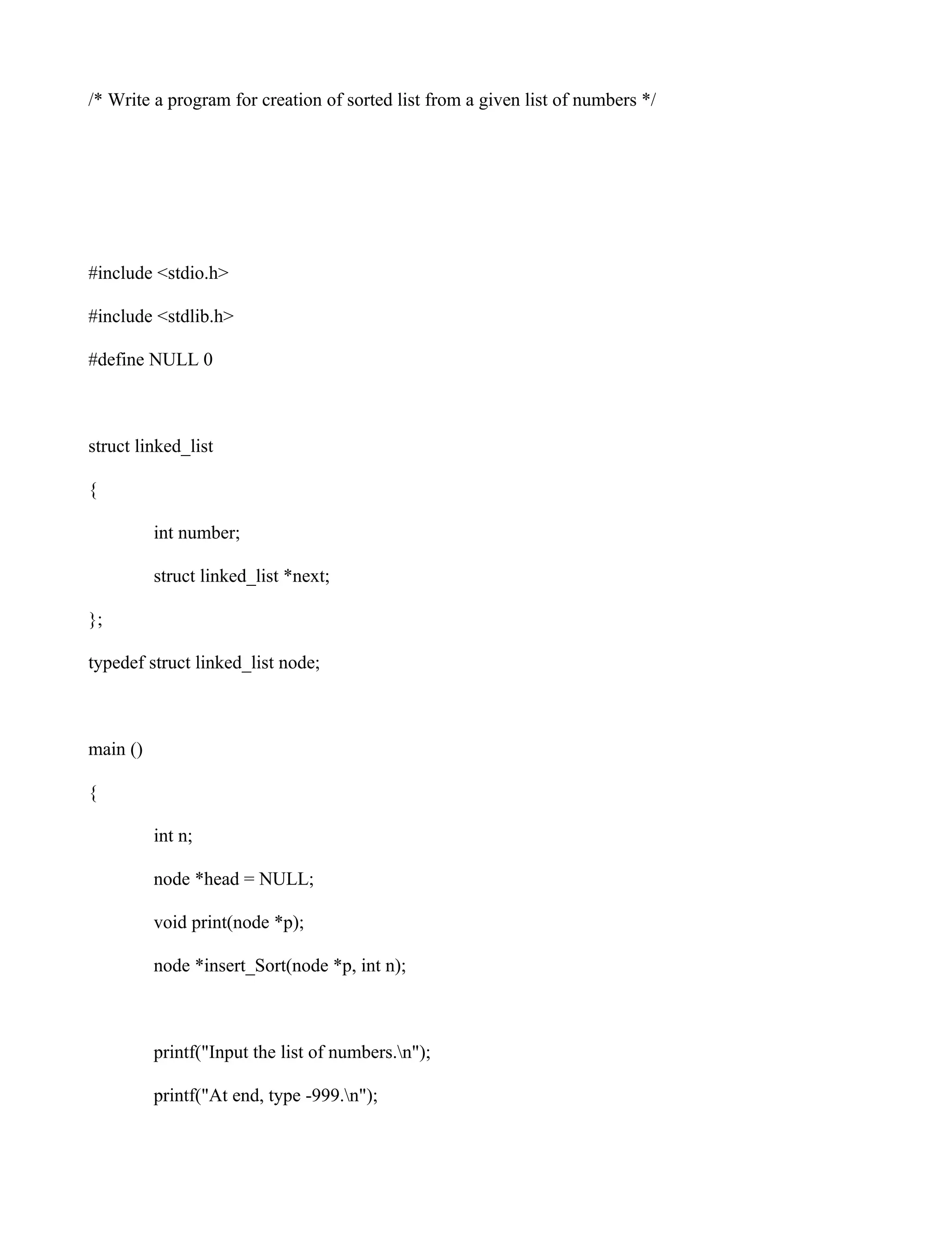 The document describes a C program to create a sorted linked list from an unsorted list of numbers. It includes functions to insert nodes in sorted order, print the list, and count the number of nodes. The main function accepts user input to build the initial list, then calls the insert_sort function to sort it and other functions to output the sorted list and count of nodes.