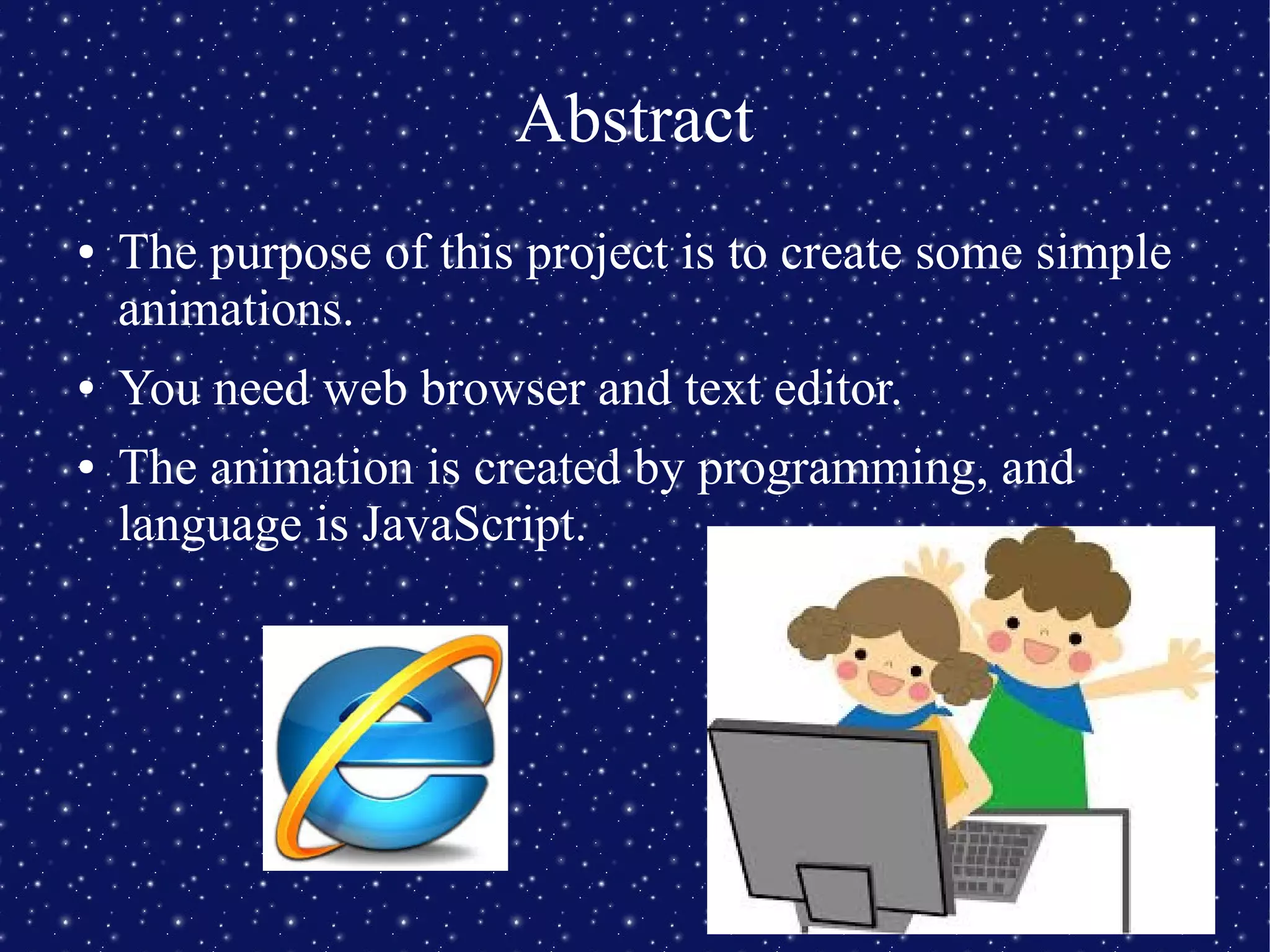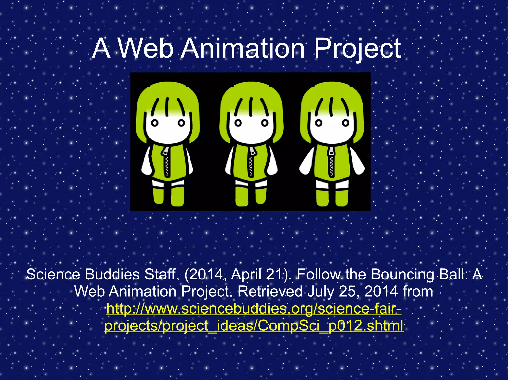 This document outlines a web animation project using JavaScript and HTML to create simple animations, focusing on a bouncing ball example. It describes the necessary components for programming animations, including functions, HTML image objects, and timing controls. The project emphasizes that animation can be achieved through web browsers and text editors, making it accessible and engaging.