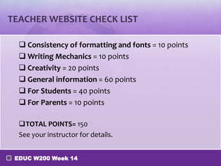 This document provides checklists and guidance for students to develop a teacher website and e-portfolio as part of an EDUC W200 class. It includes point values for different website and e-portfolio sections and instructs students to consult with their instructor for more details. Students are also directed to use workshop time to revise their websites and e-portfolios based on the provided checklists and standards.