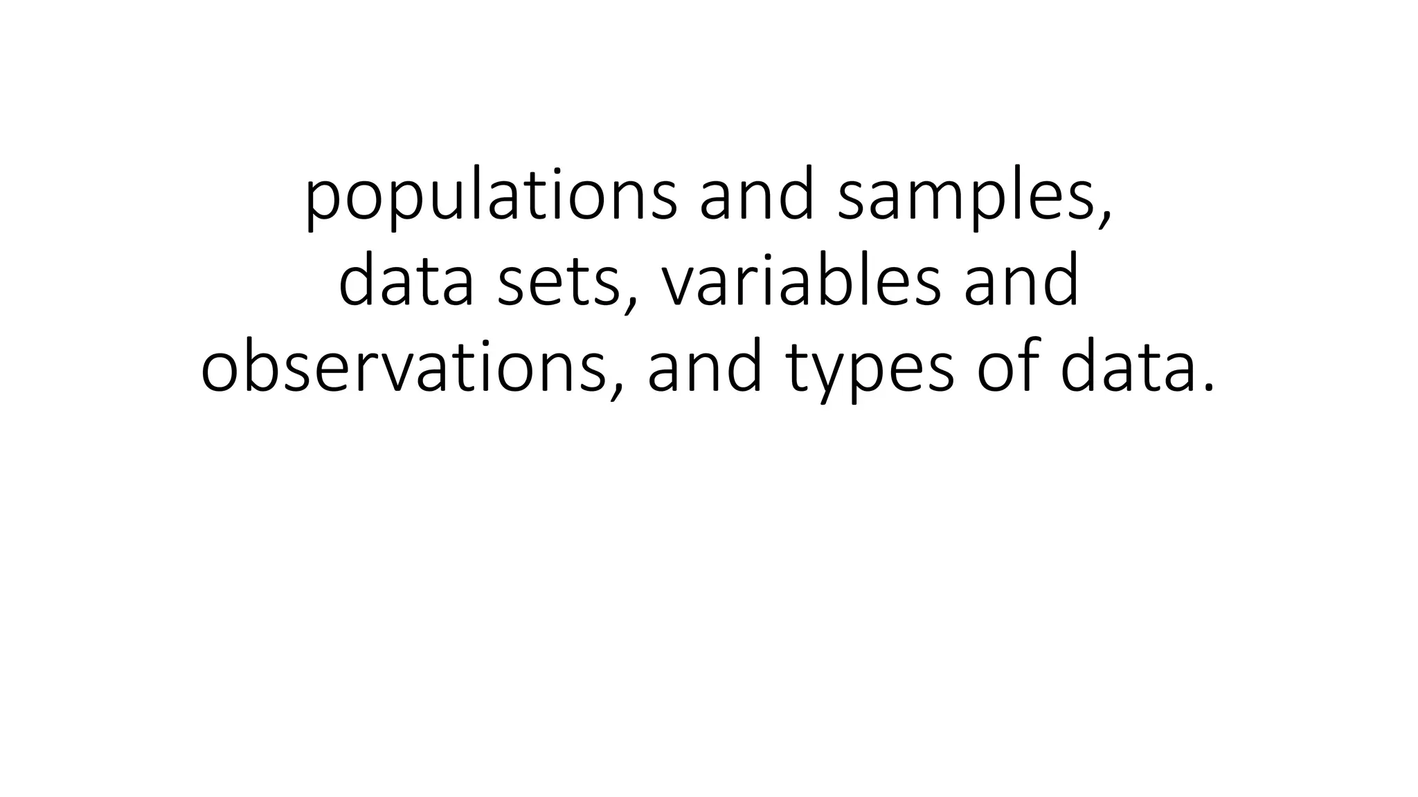 A sample is a subset of a population that is used to gain insights about the entire population. A data set contains variables, which are attributes or fields of interest, and observations, which are individual records or cases. There are different types of variables, including numeric variables that can have arithmetic performed on them and categorical variables that cannot. Categorical variables can be either ordinal, with a natural ordering of categories, or nominal, without a natural ordering.