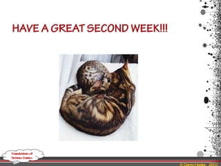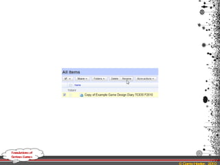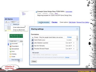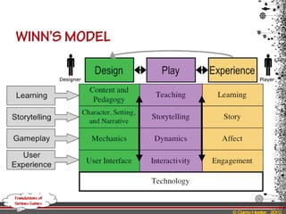 This document appears to be notes from a foundations of serious games class. It includes a list of student names and points, possible discussion topics and readings, exertion game ideas, and summaries of existing serious games that discuss their design, goals, gameplay, forms of fun, theories, effectiveness, strengths, and weaknesses.