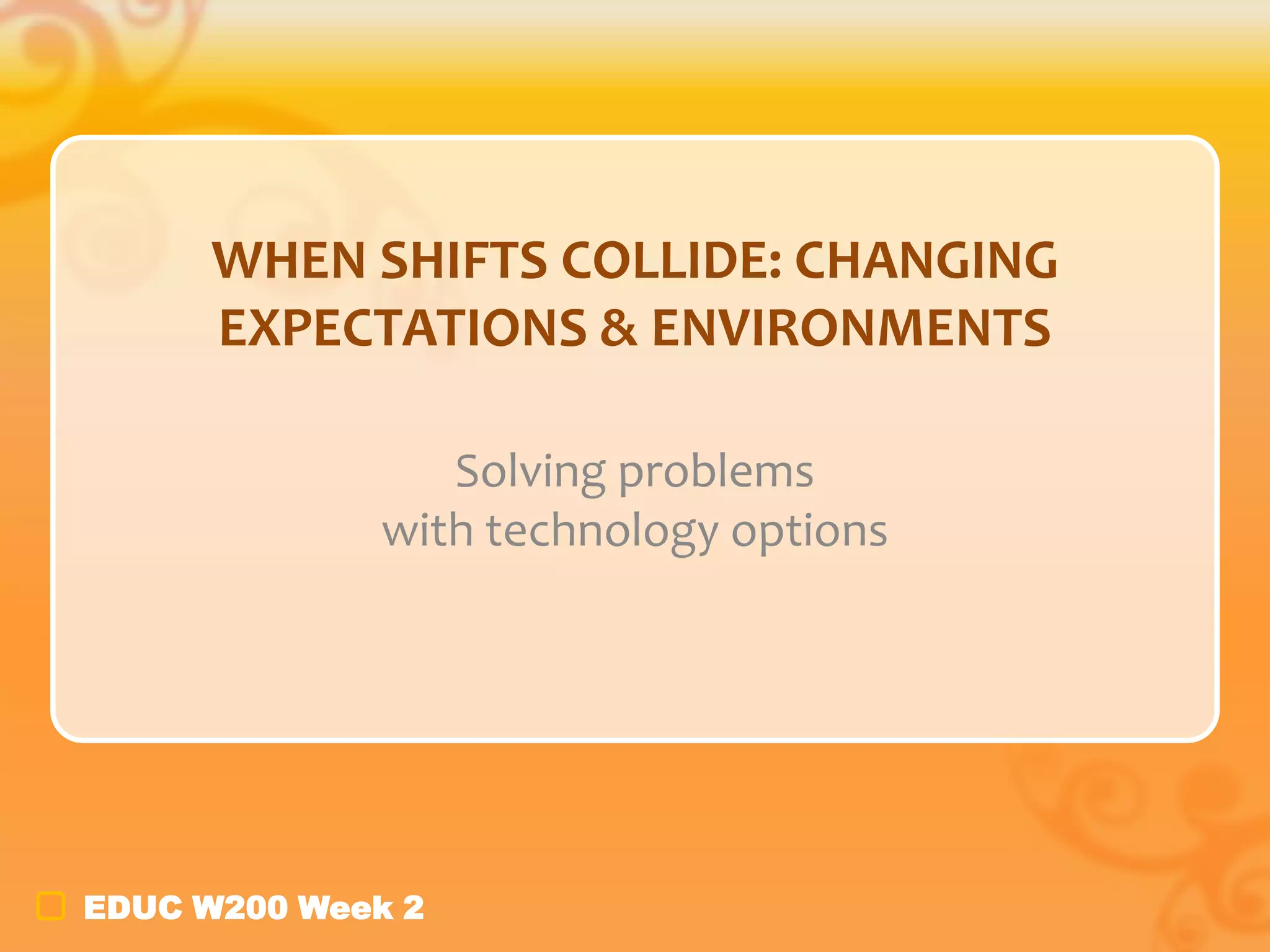 This document provides an agenda and overview for EDUC W200 Week 2. It outlines that the class is divided into three units, with this week focusing on changing expectations and environments when shifts collide. The agenda includes discussing sources of conflict, a webquest solution for inquiry-based learning, completing TIP#2 on a webquest about digital natives, a digital story workshop, and reviewing assignment due dates.