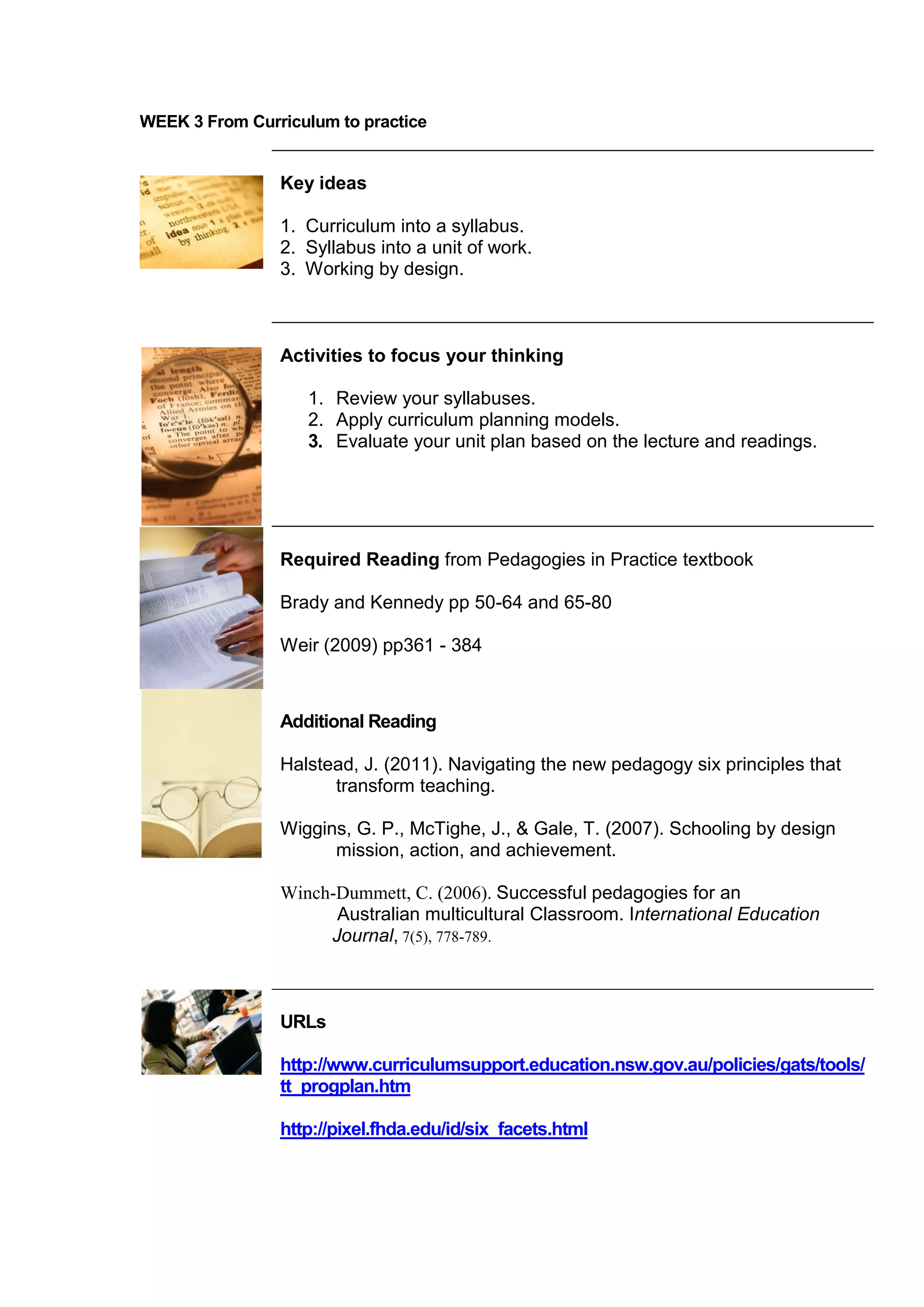 This document outlines the activities and readings for Week 3 of a curriculum course. Students are asked to: [1] Review their syllabuses and apply curriculum planning models to evaluate their unit plans based on lectures and readings; [2] Meet in groups to discuss their syllabuses and unit plans, considering how learning outcomes and assessment were chosen; and [3] Outline curriculum planning by design and discuss how it relates to their unit plans, making changes if needed to better support a backward design approach.
