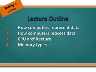This document summarizes key concepts about how computers represent and process data. It discusses: