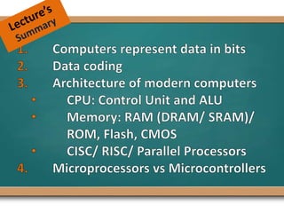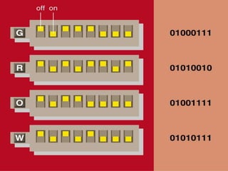 1. How computers represent data using bits, bytes, and text encoding standards like ASCII and Unicode.