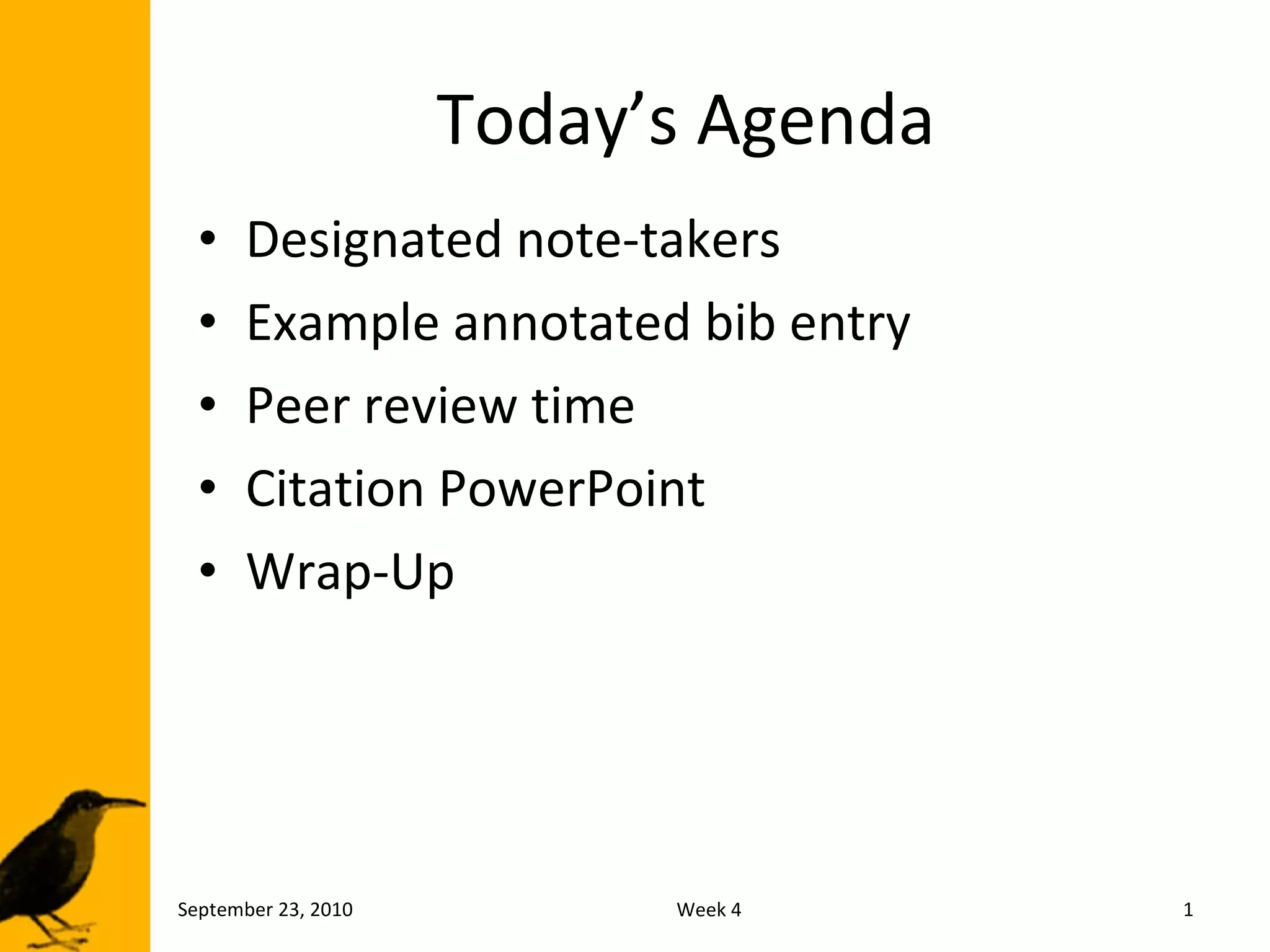 The document outlines the agenda for a class meeting, including note takers, an example of an annotated bibliography entry, peer review instructions, and a wrap up. The agenda includes having two students volunteer to take notes and email them to the instructor, an example of an annotated bib entry with details on source content and relevance, guidelines for peer reviewing a classmate's paper including sample questions to consider, and due dates for future assignments.