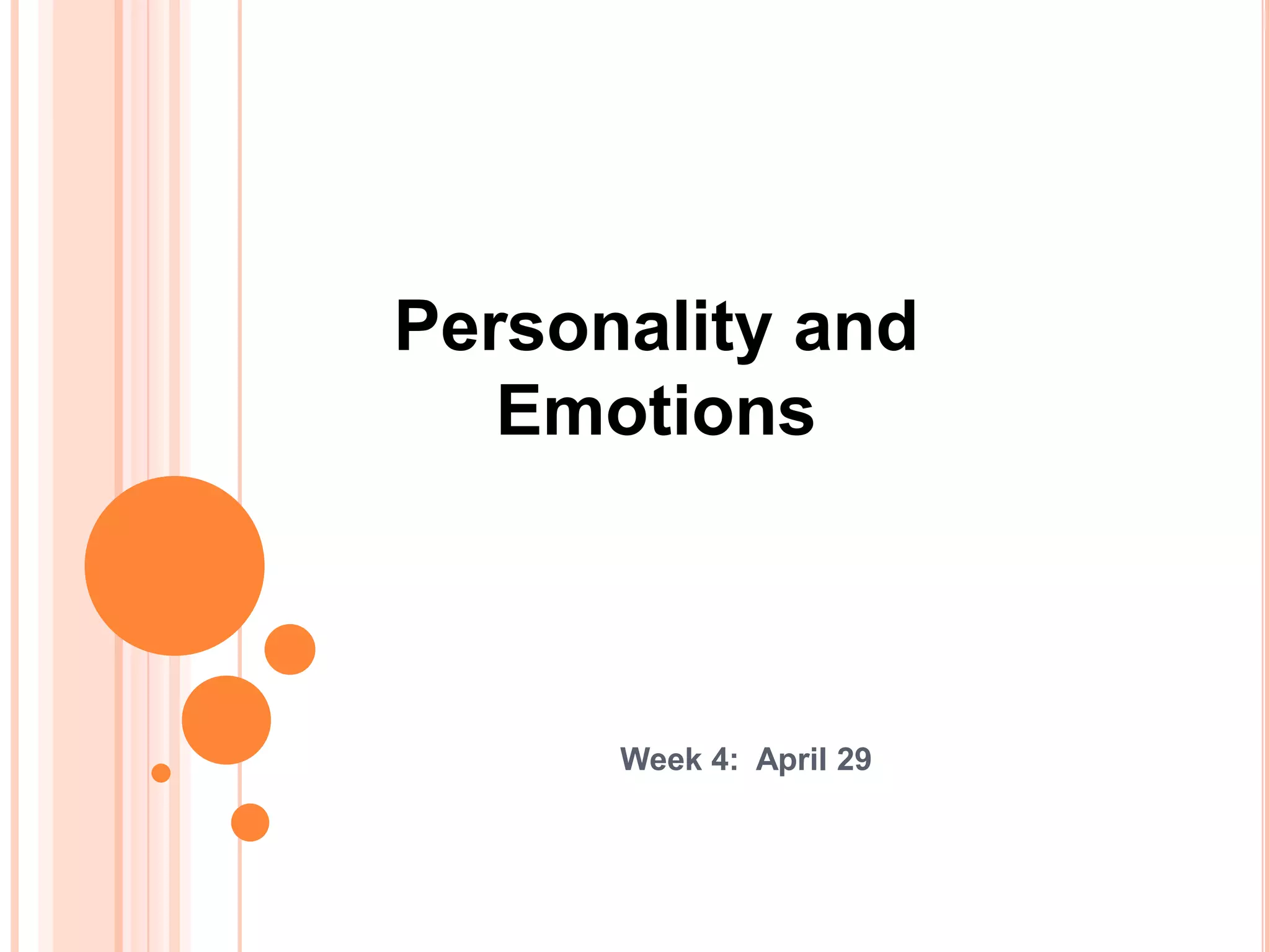 This document discusses personality and emotions. It defines personality and how it is influenced by both genetics and environment. Two common models for assessing personality are discussed: the Myers-Briggs Type Indicator and the Big Five personality traits. Emotions and moods are distinguished, with emotions being more intense and directed while moods are less intense and have less clear causes. Sources of emotions and moods include the day of the week, weather, stress levels, social activities, sleep, exercise, age, and gender. The document also discusses how moods can impact creativity and how managers can influence the mood of their employees.